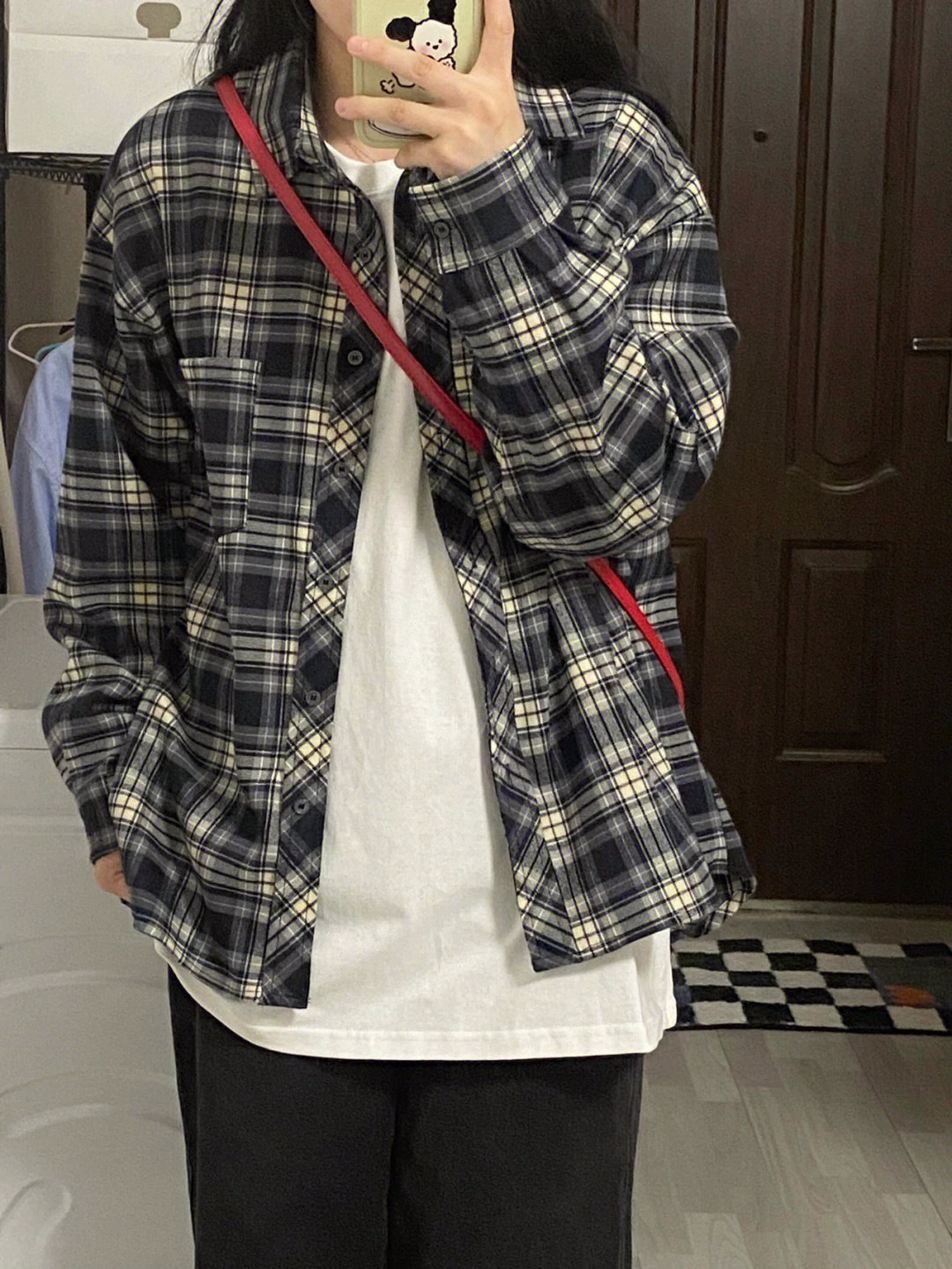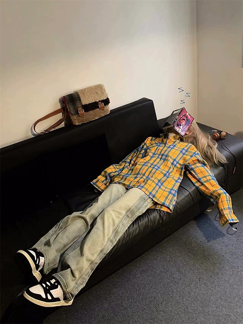 vintage retro wool edge long -sleeved grid shirt
