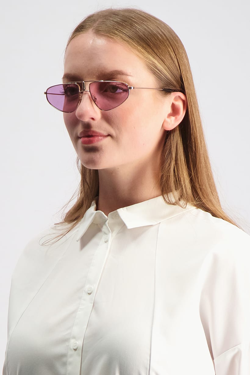 This product boasts a full rim gold frame with violet lenses made of acetate material, providing UV ray protection. It also includes adjustable nose pads for added comfort. Please note that the product color may differ slightly due to photographic lighting sources or monitor settings. The color family of this item is purple and gold.