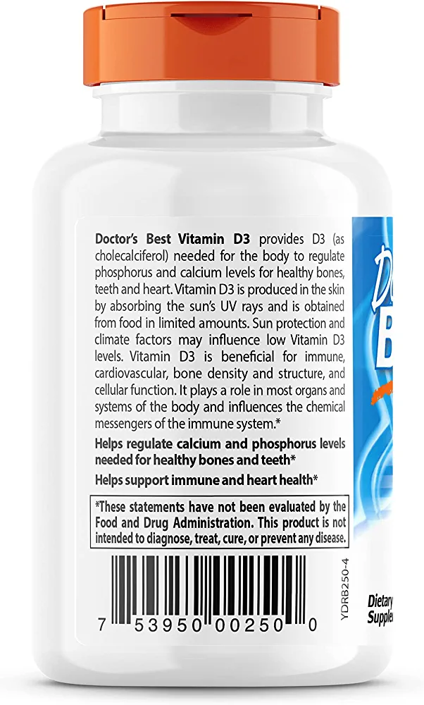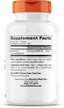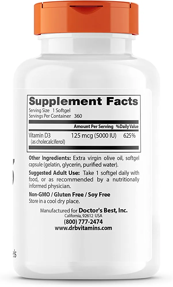 | nameOriginal | Doctor's Best Vitamin D3 5,000 IU for Healthy Bones, Teeth, Heart and Immune Support, Non-GMO, Gluten-Free, Soy Free, 360 Count (Pack of 1) |