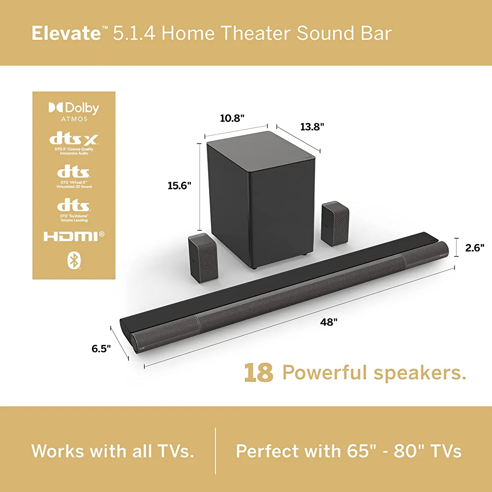| nameOriginal | VIZIO Elevate Sound Bar for TV, Home Theater Surround Sound System for TV with Subwoofer and Bluetooth, P514a-H6 5.1.4 |
