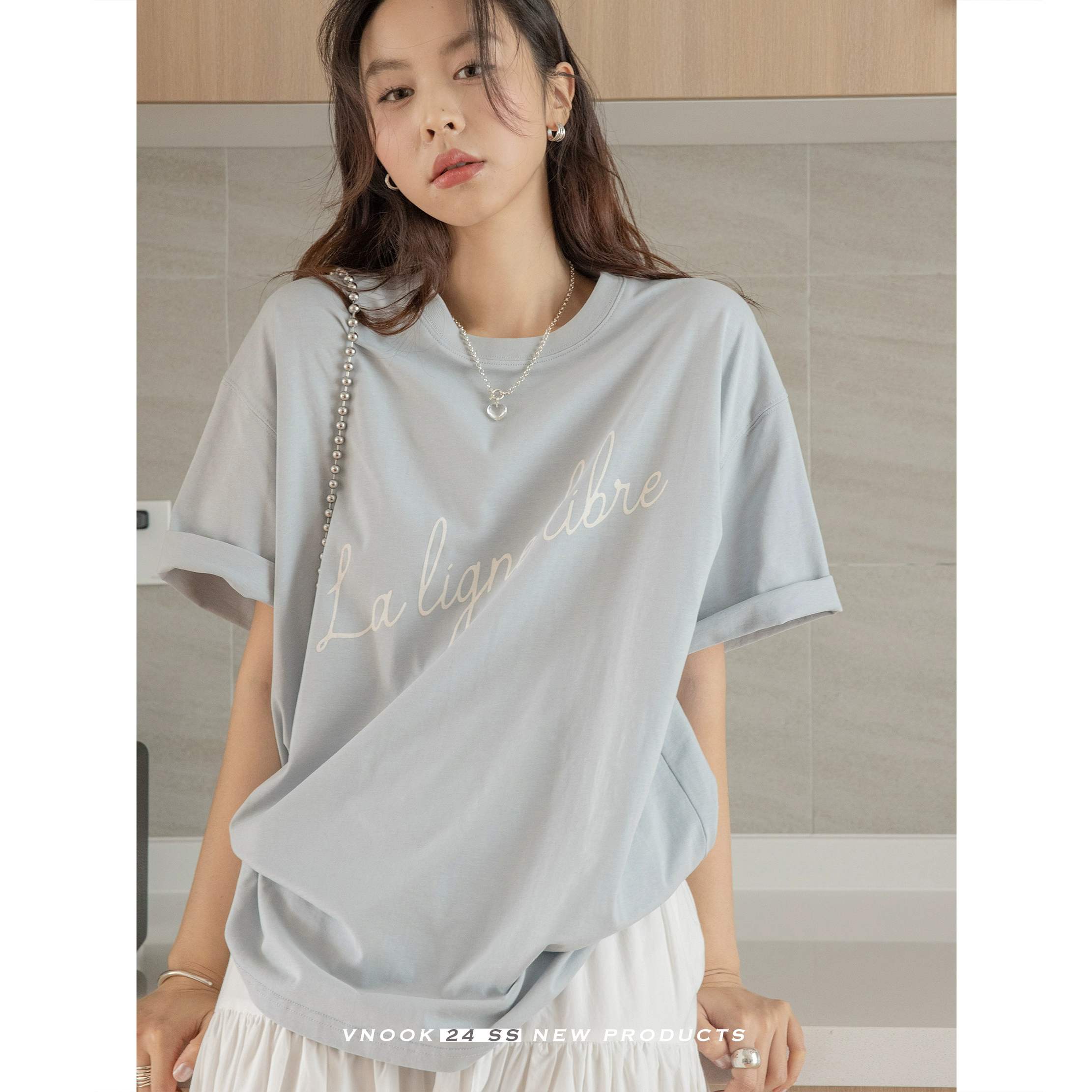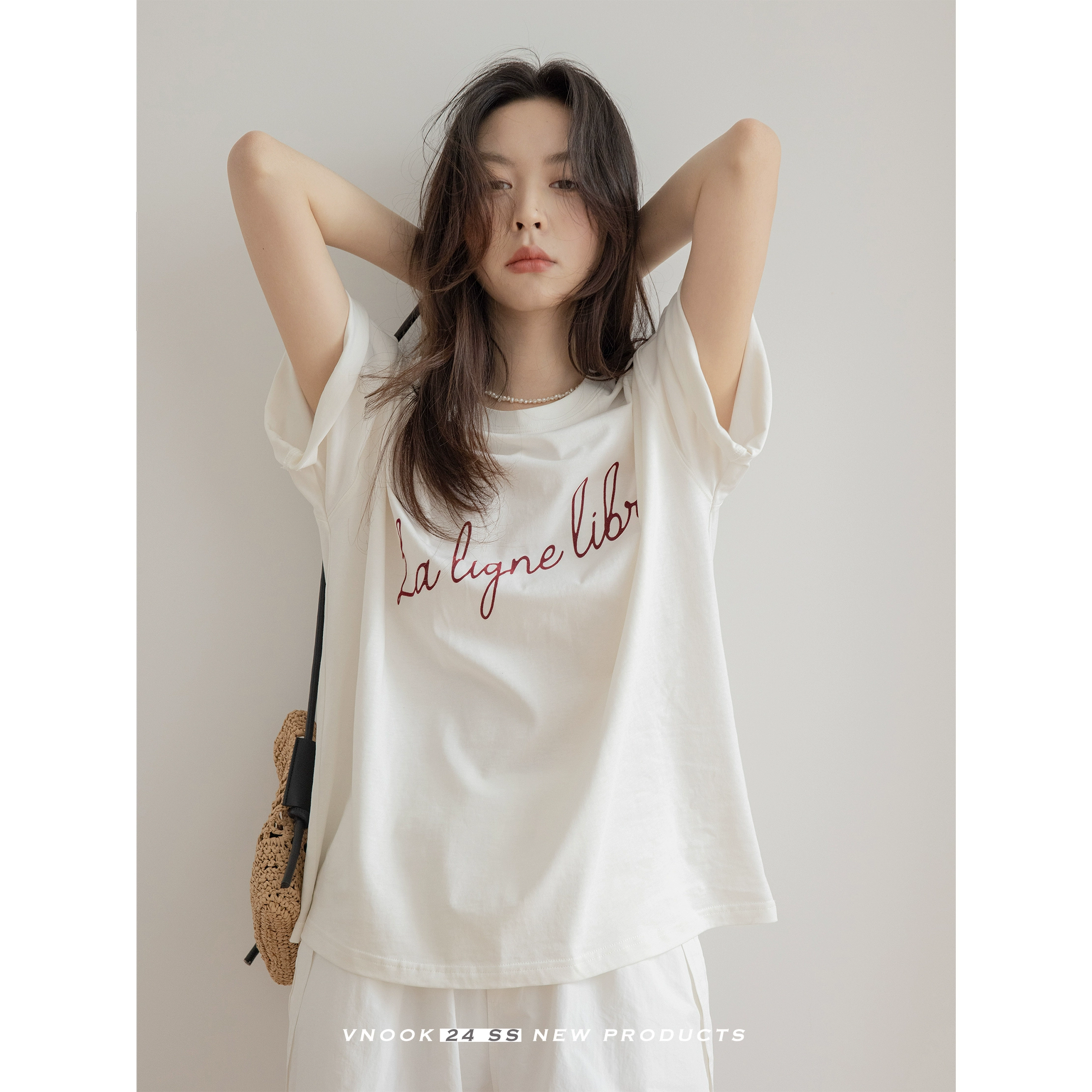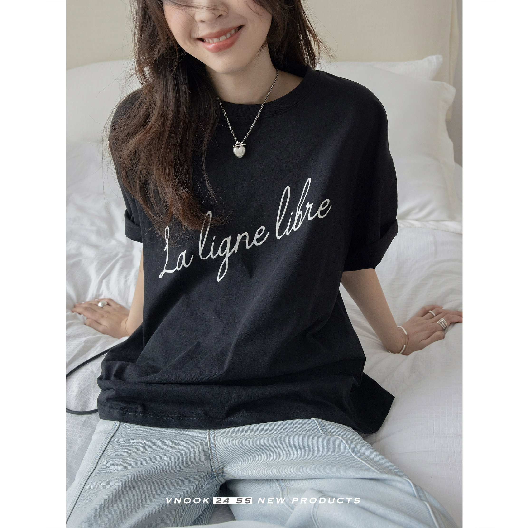 | nameOriginal | VNOOK knitted cotton letter T-shirt short-sleeved women's round neck dropped shoulder loose flocking casual all-match solid color top summer |