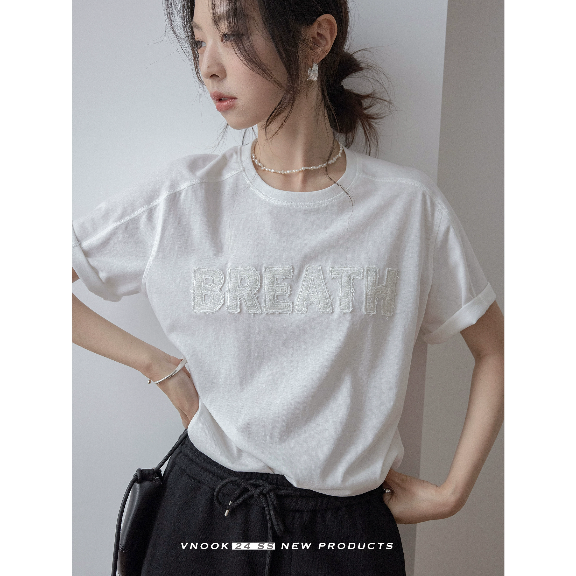 | nameOriginal | VNOOK white short-sleeved T-shirt for women summer 2024 new loose and versatile pure cotton half-sleeved patch embroidered solid color top |