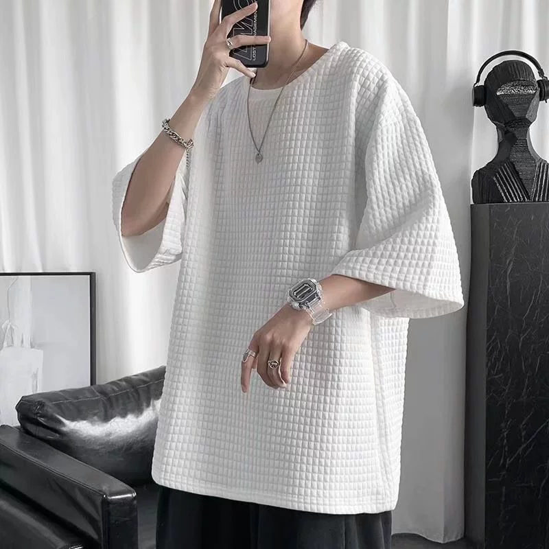 Waffle short-sleeved T-shirt men's Hong Kong style ins loose and versatile three-quarter sleeve summer trend Korean style youth T-shirt