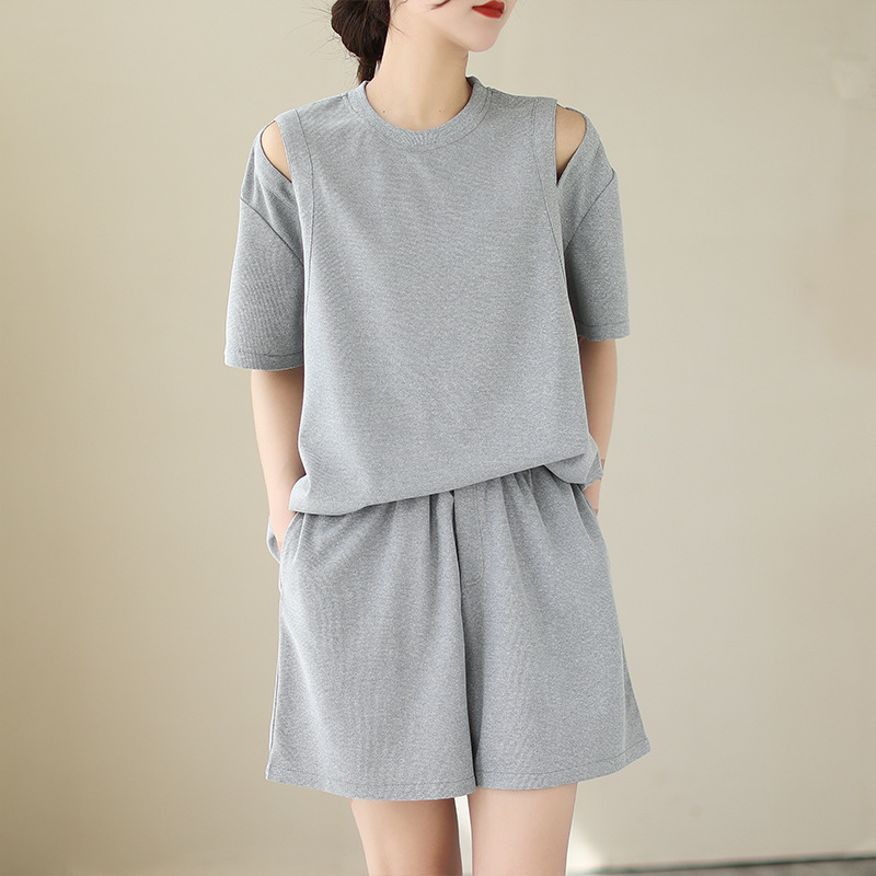 | nameOriginal | Waffles Crewneck Short Sleeve Off-the-shoulder Top Staggered Waist Loose Straight Shorts Fashion Set |