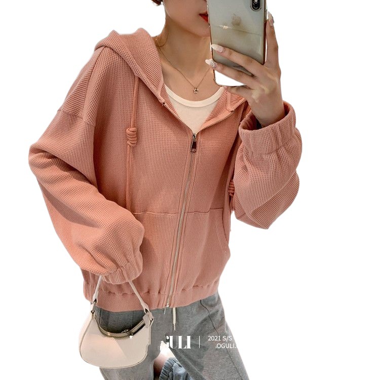 | nameOriginal | Waffley Hooded Short Coat Women's 2021 Spring and Autumn Solid Color Loose Sweater Female Student Thin Zipper Cardigan Top |