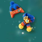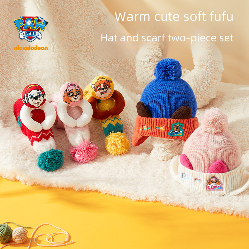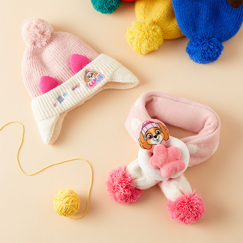 Wangwang team Children's hat scarf two-piece boys' fleece-lined cartoon wool hat girls' pullover ear protection knitted hat