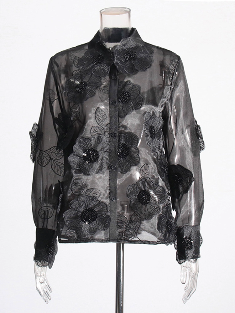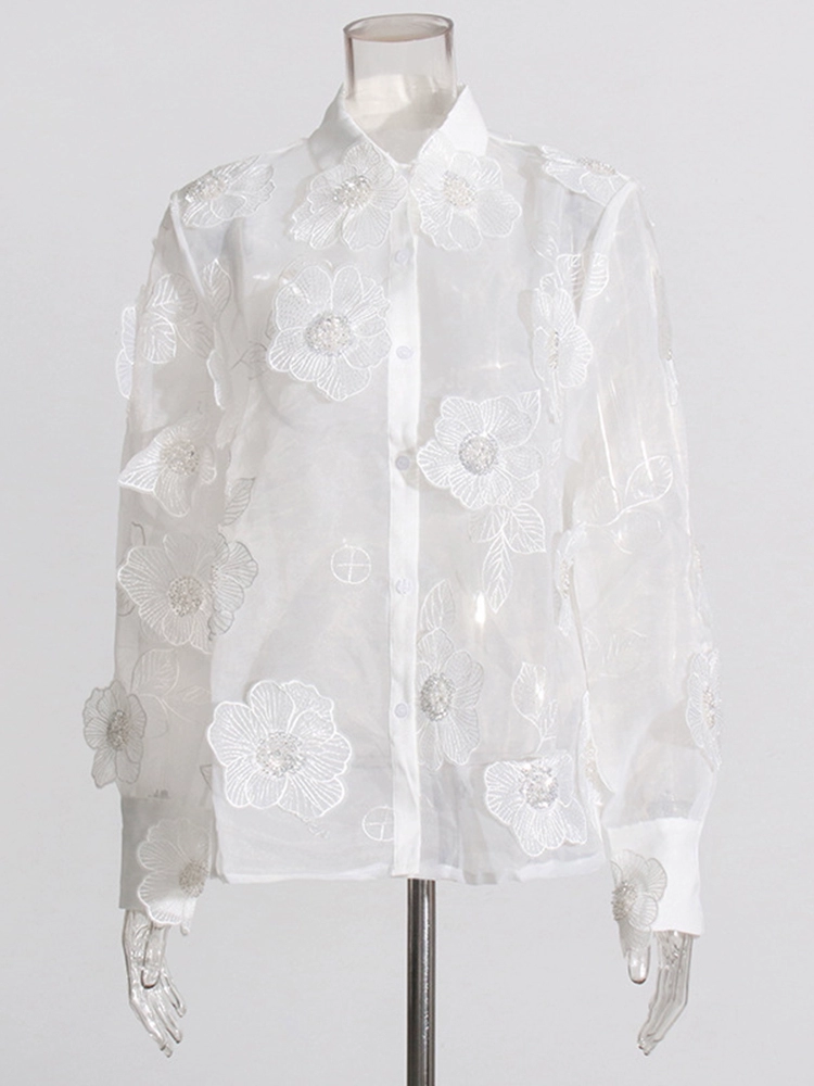 | nameOriginal | Warren's heavy industry organza texture see-through lapel shirt solid color three-dimensional flower sequin beaded top shirt |