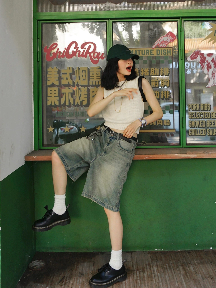 Washed distressed retro straight denim shorts 2024 new high-waisted loose wide-leg mid-pants slimming five-point pants
