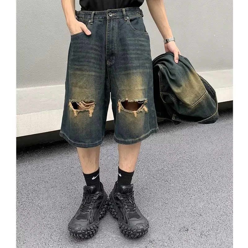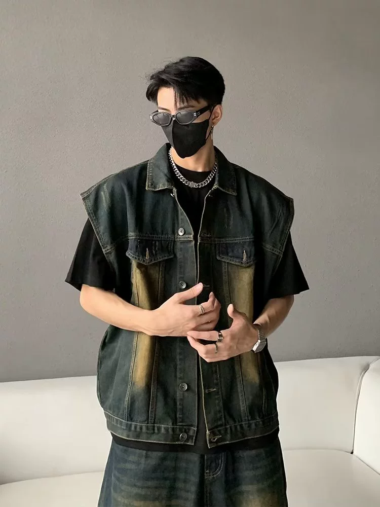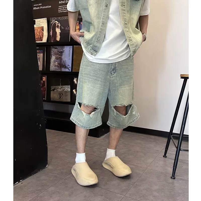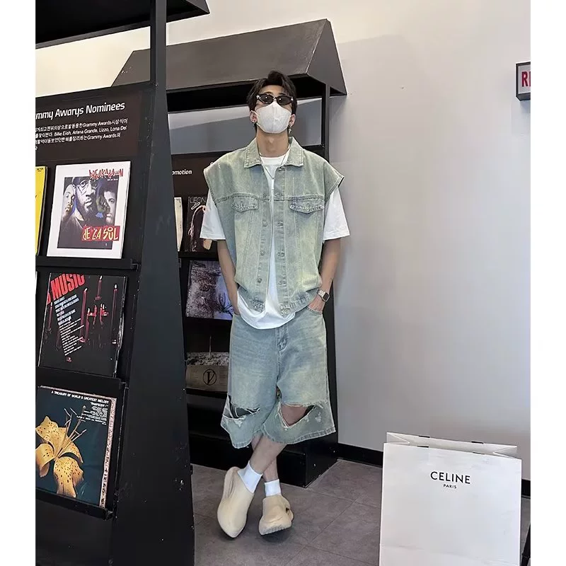 Washed distressed ripped shorts and two denim vests