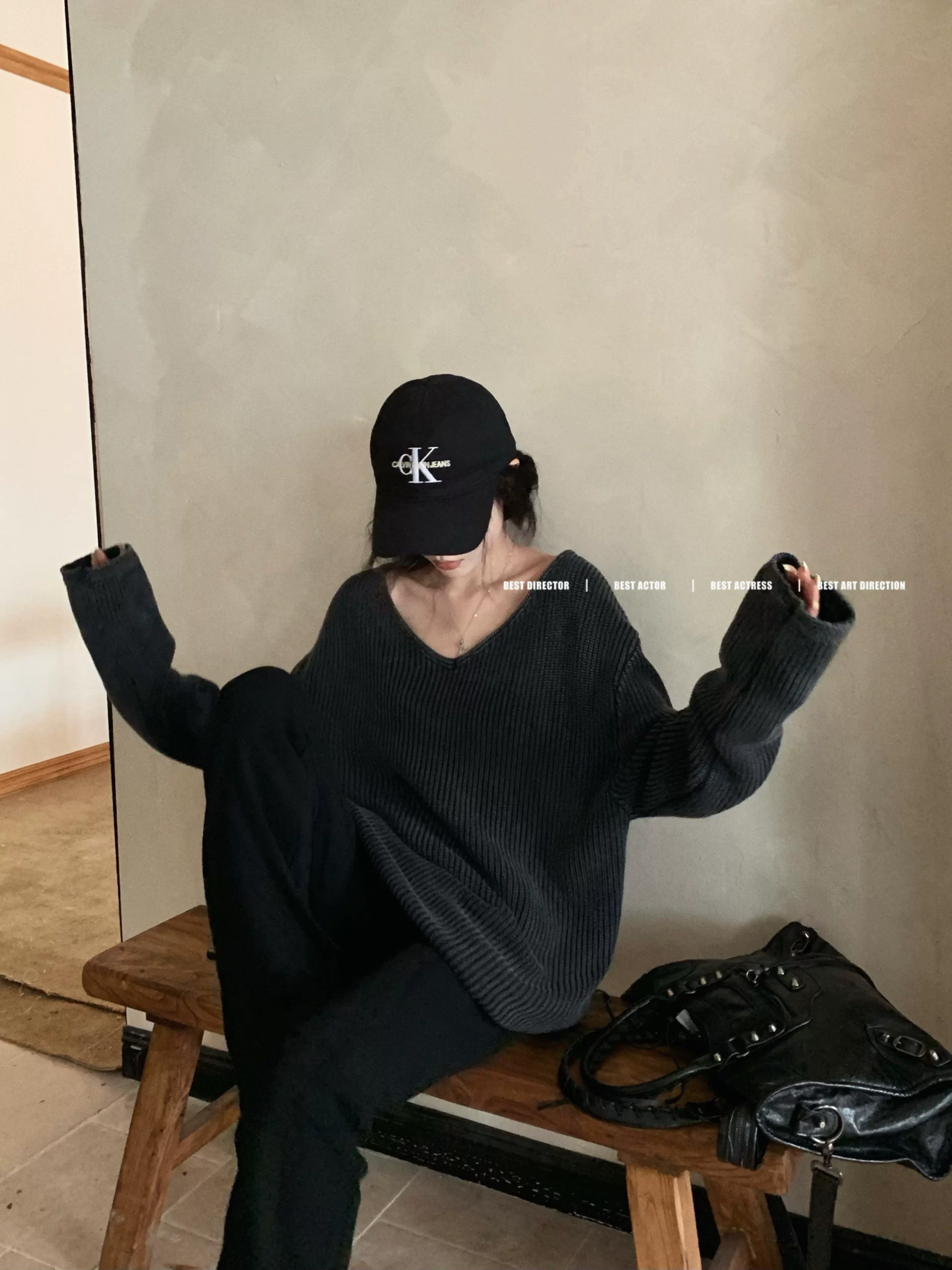 | nameOriginal | Washed gray loose spring slimming knitted v-neck sweater |