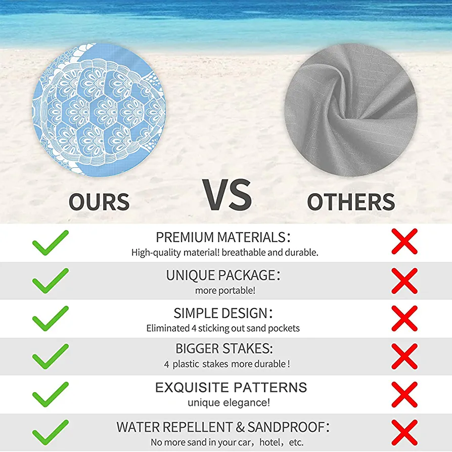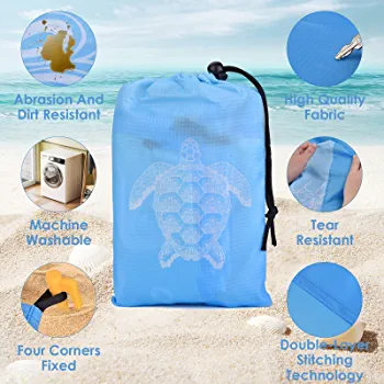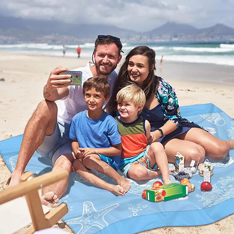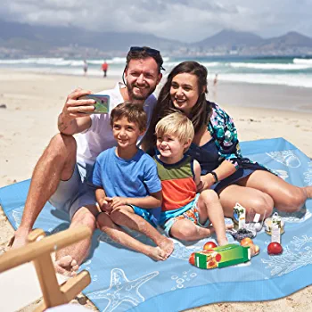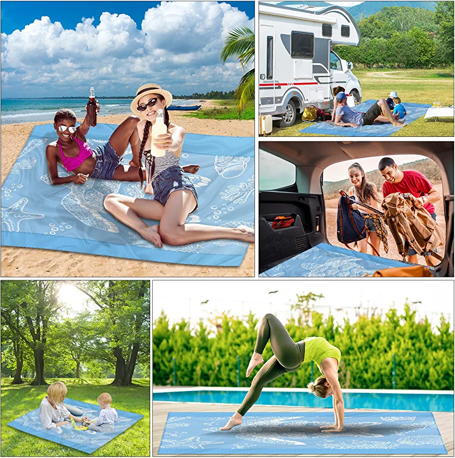This beach mat is made of high-quality 210D polyester fiber that is both durable and water-resistant. It can comfortably accommodate 4-6 adults sitting or 4 adults lying down. The beach blanket is designed to be sand-proof and waterproof, with four pockets to hold sand or rocks to keep it in place. It is also made of breathable and lightweight rip-stop 210T polyester that repels water. This versatile mat can be used for various outdoor activities such as camping, picnics, hiking, and festivals. It is easy to clean by wiping the waterproof backing with a towel or tissue and shaking off any dirt or sand. We offer a satisfaction guarantee and will take care of any quality-related issues, replacements, or refunds. If you have any questions, please contact us.