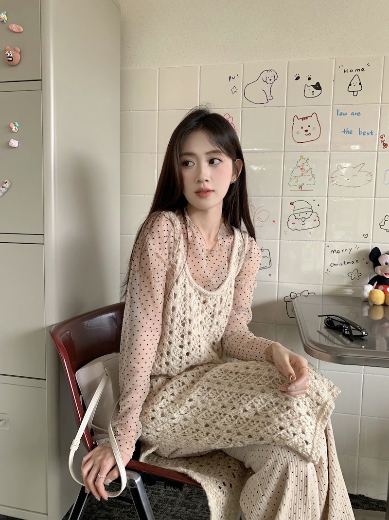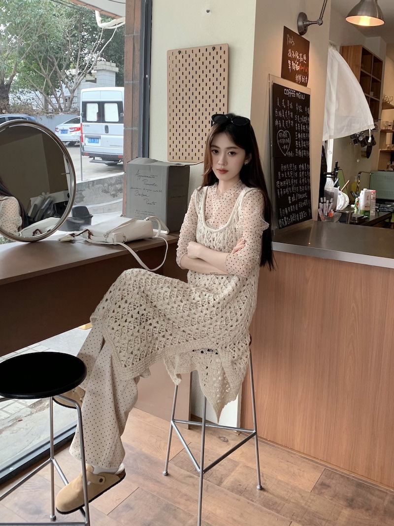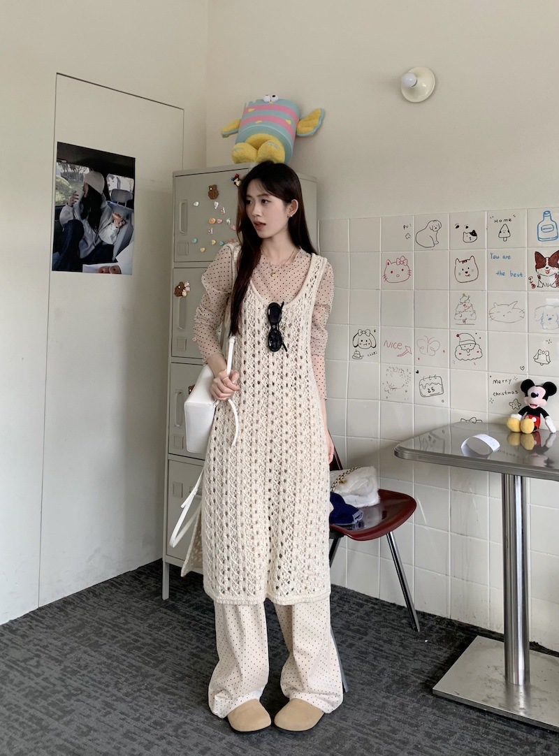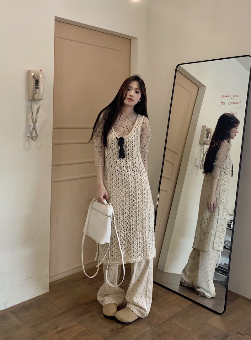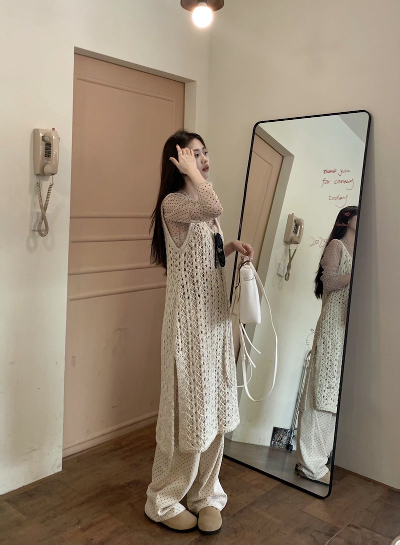 | nameOriginal | ~ Wave Point Stacked Bottom Shirt Hollow Knitted Vest Dress Apricot Wave Point Casual Pants Suit Women |
