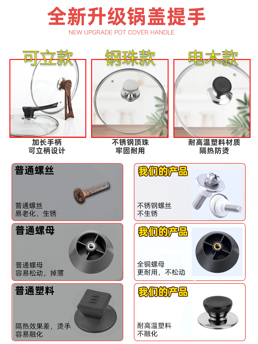 WBZ7 universal pot lid handle stainless steel silicone anti-scald high temperature resistant household pot cap handle glass head handle