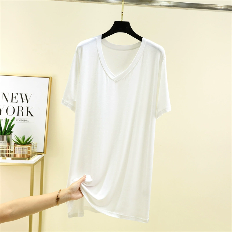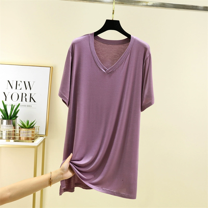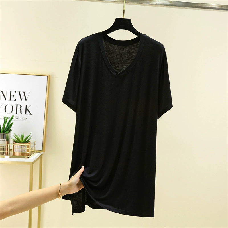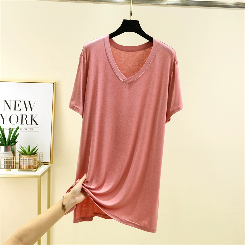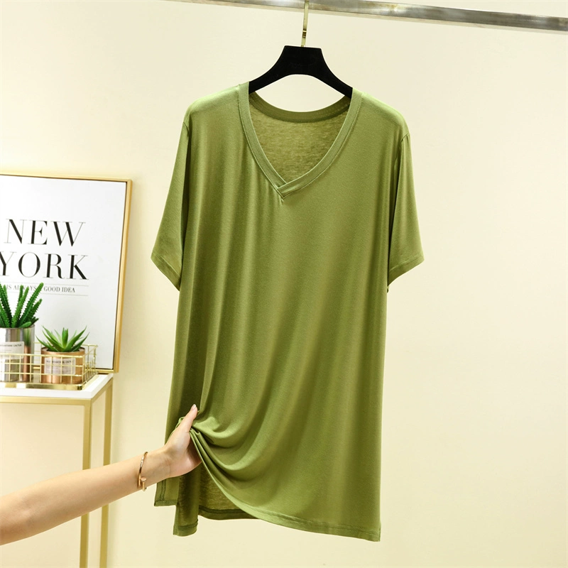 | nameOriginal | Wear modal v-neck short-sleeved T-shirt for women summer thin mid-length inner bottoming shirt solid color large size t-shirt top |