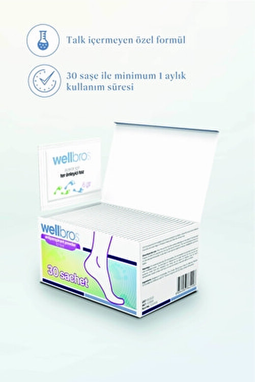 The extra-strong formula of Wellbros Anti-sweat Powder for Feet, consisting of herbal extracts, targets odor at an instant source. It eliminates sweat and moisture. Helps keep feet dry all day long, while preventing bad odors. GMOs, dyes, alcohol, sulfates, paraben and perfume free! The product consisting of 30 pieces of Sachet provides easy use. For all day long dryness, you just need to use one Sachet. Instructions for Use:. Pour the sake preferably into the sock so that it comes to the soles and fingers. It is enough to use 1 piece of sache daily. Disperse the powder by moving the foot in the sock. Can also be applied in shoes. Suitable for all skin types.