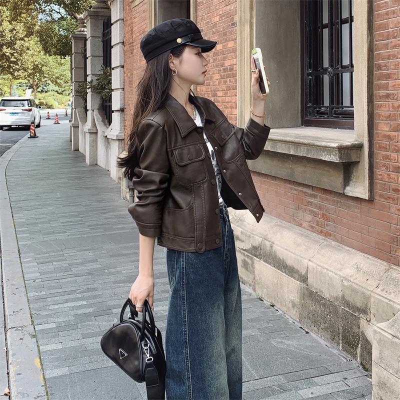 Western style Brown short leather coat for women Spring and Autumn 2023 new motorcycle clothing PU leather jacket small American style