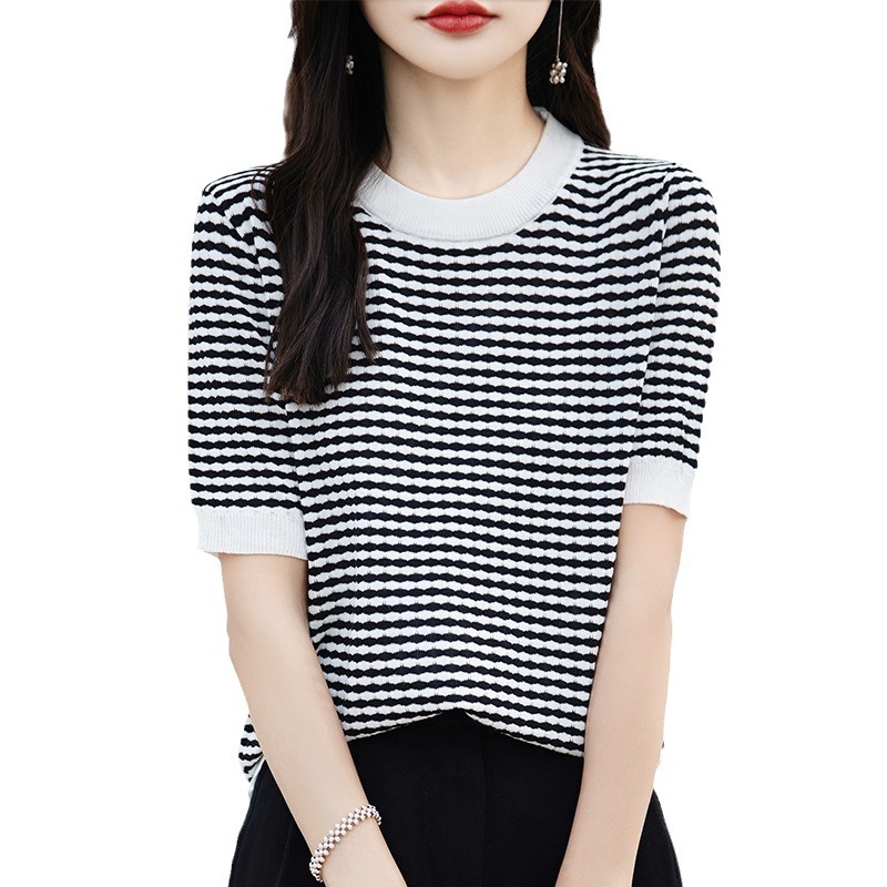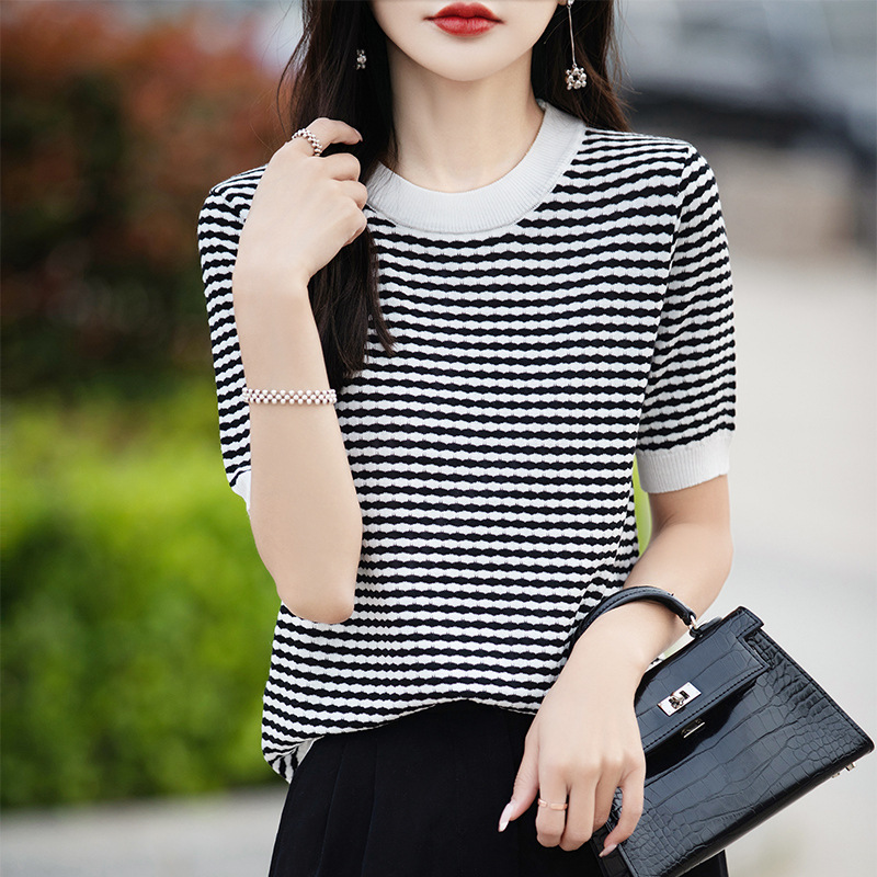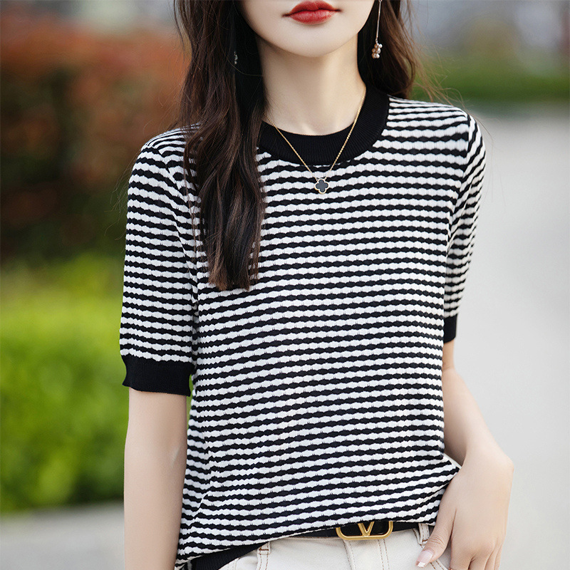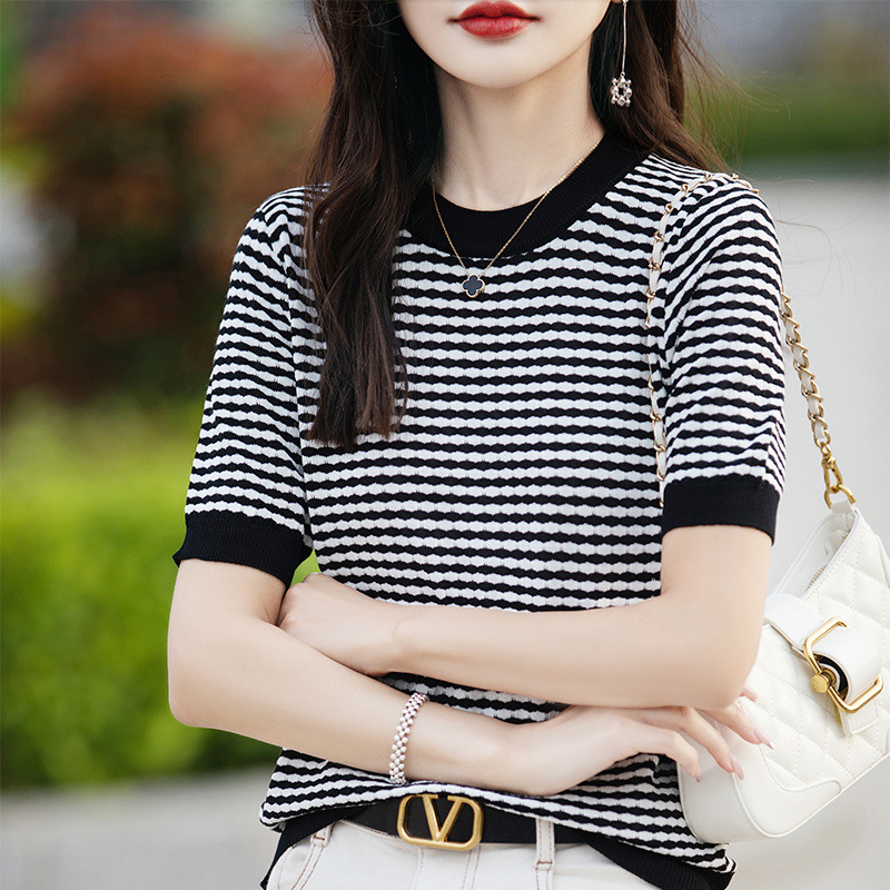 | nameOriginal | Western Style Ice Silk Knitted Jacquard Short-sleeved Women's Summer New Arrival Half-sleeved Niche Design Sense Prid Striped T-Shirt Knitted Sweater |