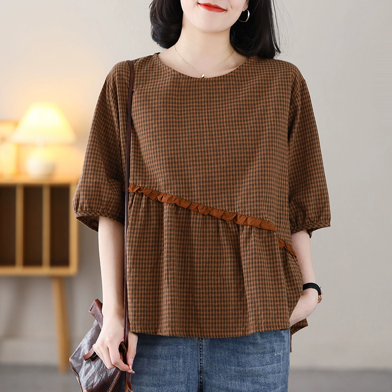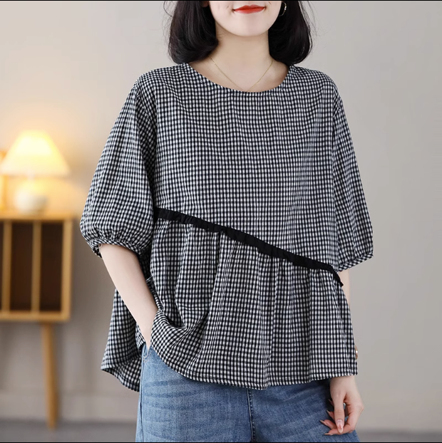 | nameOriginal | Western-style patchwork plaid casual cotton and linen lantern sleeve shirt |