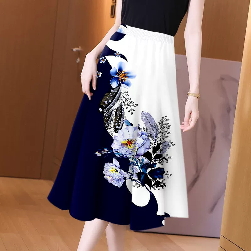 Western-style printed draped slimming, flesh-covering mid-length skirt above the knee