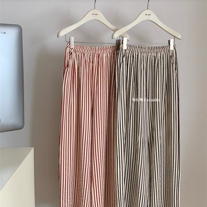 WGWE striped series black and white elastic high-waisted casual pants for women covering the crotch, showing slimming and loose feeling, wide-leg trousers for summer