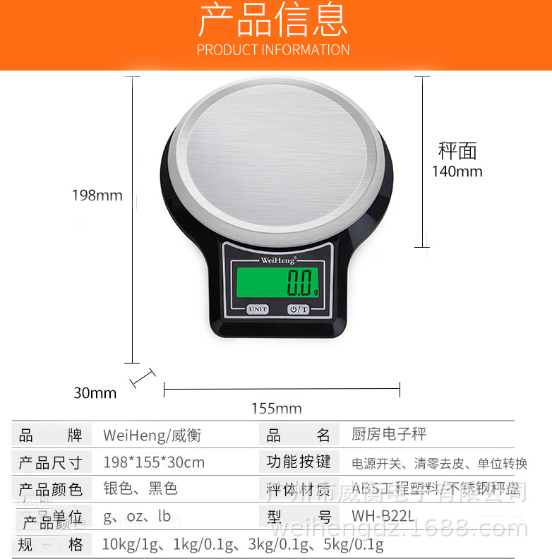 | nameOriginal | WH-B22 Weiheng Stainless Steel Kitchen Electronic Scale Baking Electronic Scale High Precision Electronic Kitchen Scale 5kg/0.1g |