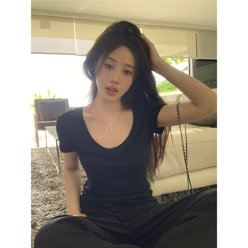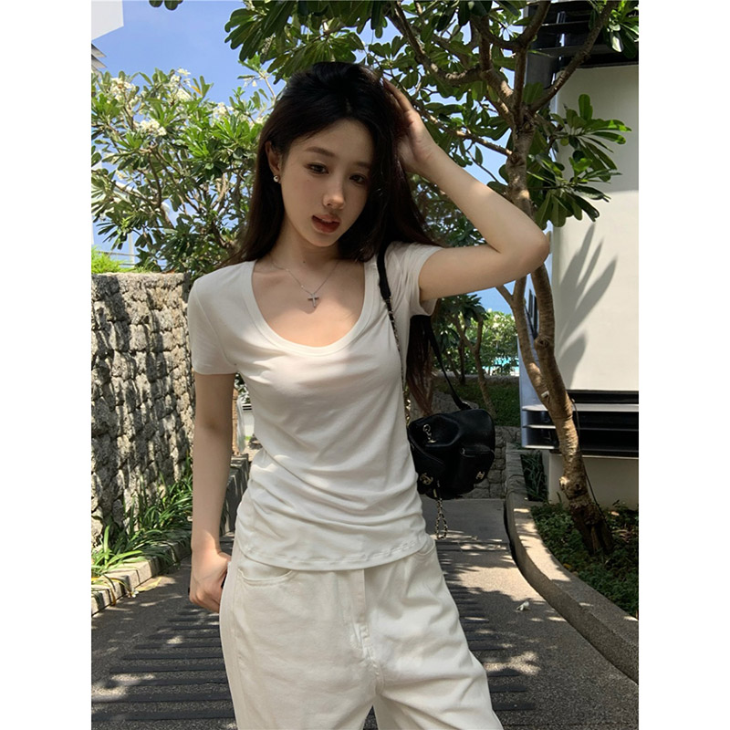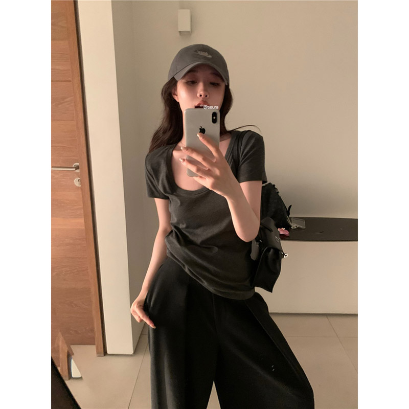 White All-match U-collar Short-sleeved T-shirt Women's Summer High Elastic Thread Inner Slim Shoulder Base Shirt Grey Top