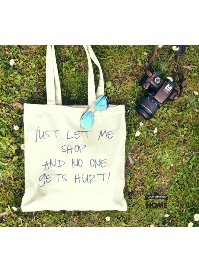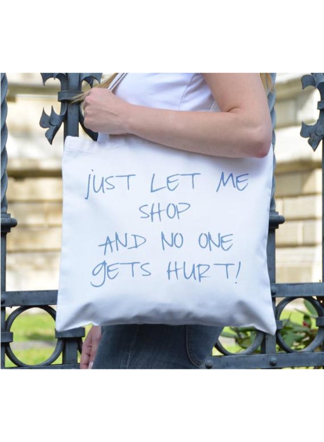 White and beige beach tote bag with the phrase “Just Let Me Shop And No One Gets Hurt”.