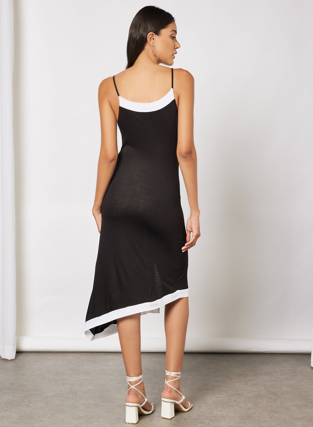White and black bodycon midi dress with boat neck and contrast color straps for a casual look.