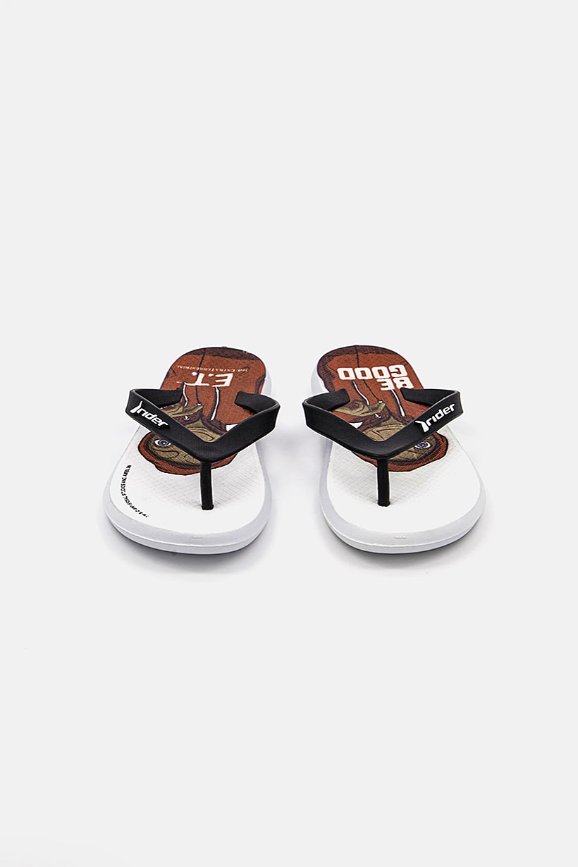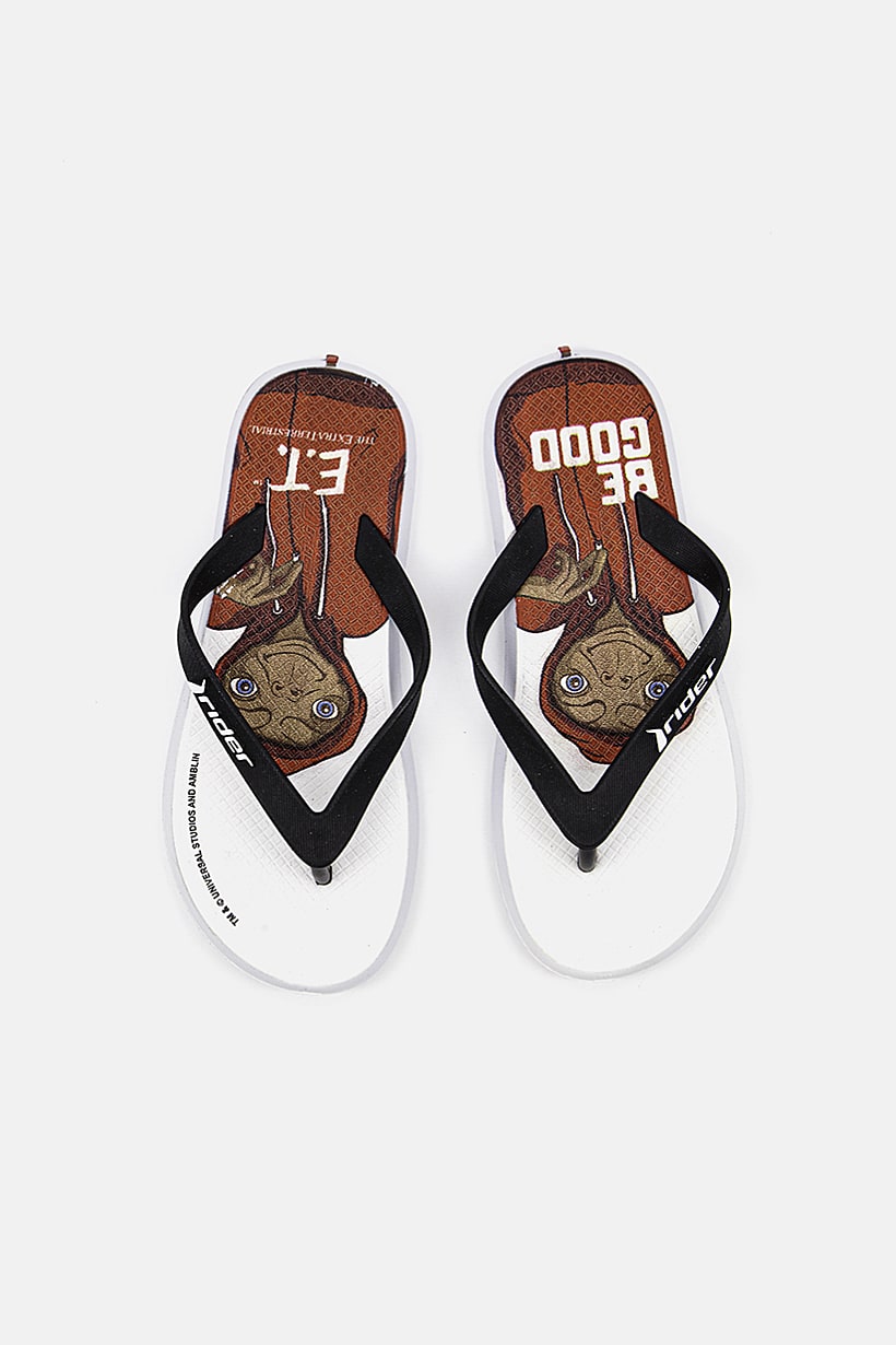 White and black slip-on flip flops with printed design for boys.