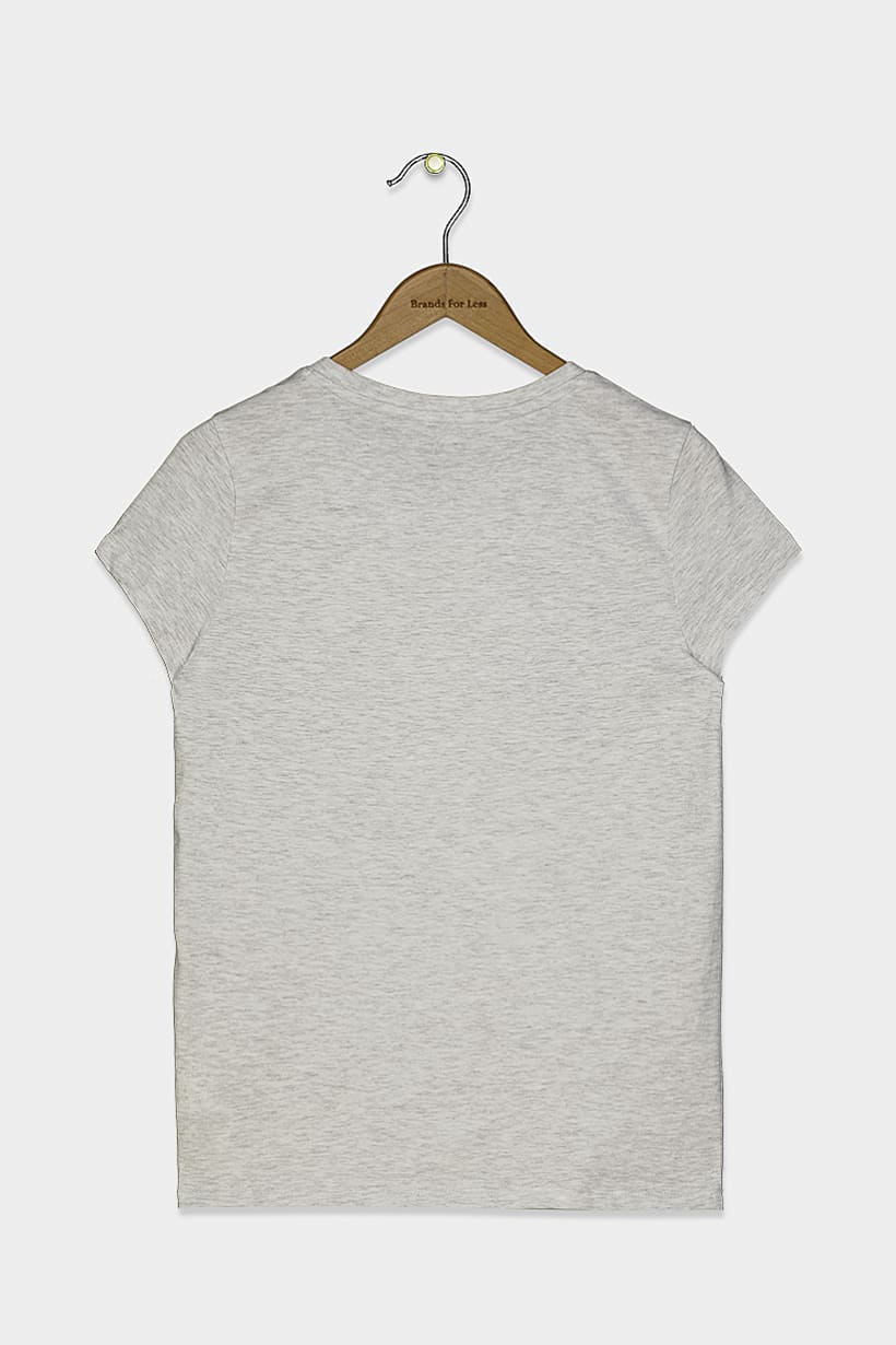 This product is suitable for girls and can be easily washed in a machine. It features a round neckline and short sleeves with a straight hem. The fabric is made of 99% cotton and 1% viscose, making it comfortable for casual occasions. The brand logo is printed on the shirt and it has a pullover closure. Please note that the product color may vary slightly due to lighting or monitor settings. The color of the shirt is grey.