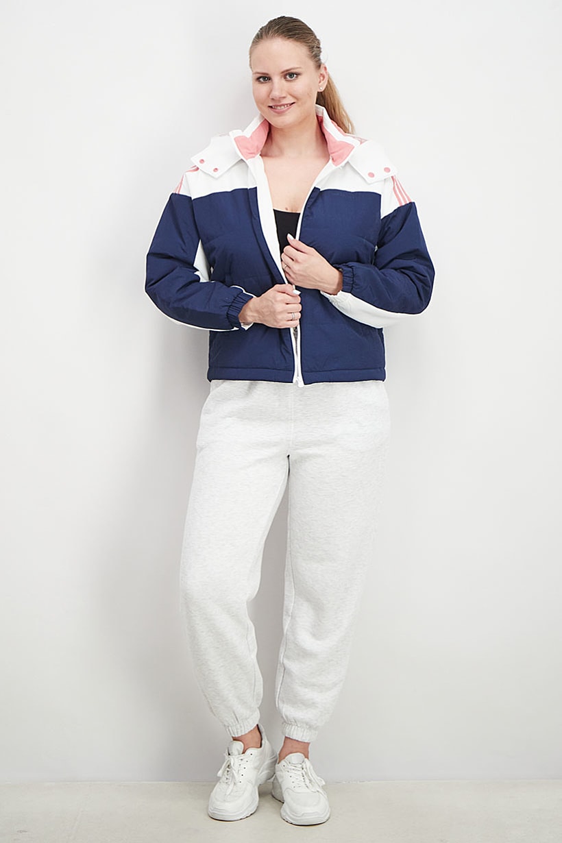 White and Navy Women’s Sporty Hooded Bomber Jacket with Long Sleeves.