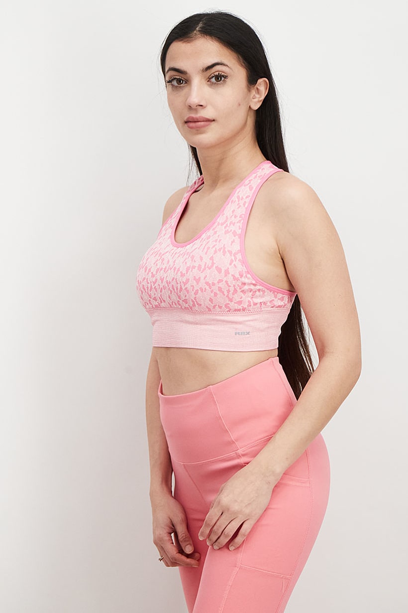This sports bra is designed for training and has a regular fit. It is made of a light fabric blend of 67% polyester, 29% nylon, and 4% spandex. The product is machine washable and comes in a plain/solid pattern. It is available in US sizes and comes in pink and white color options. Please note that the product color may vary slightly due to photographic lighting sources or monitor settings.