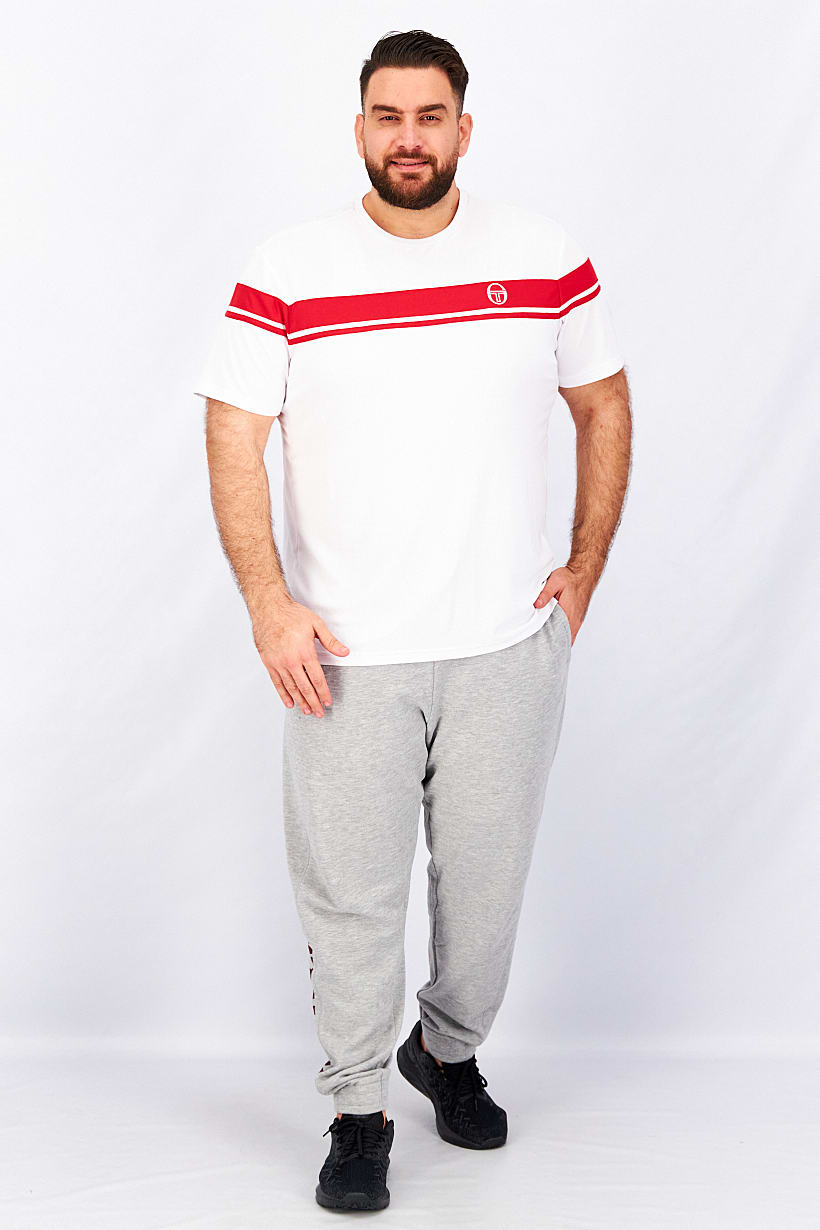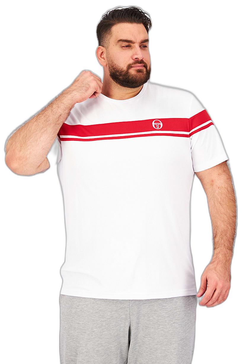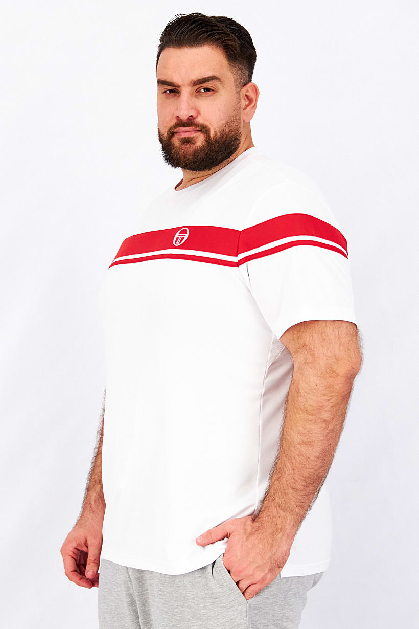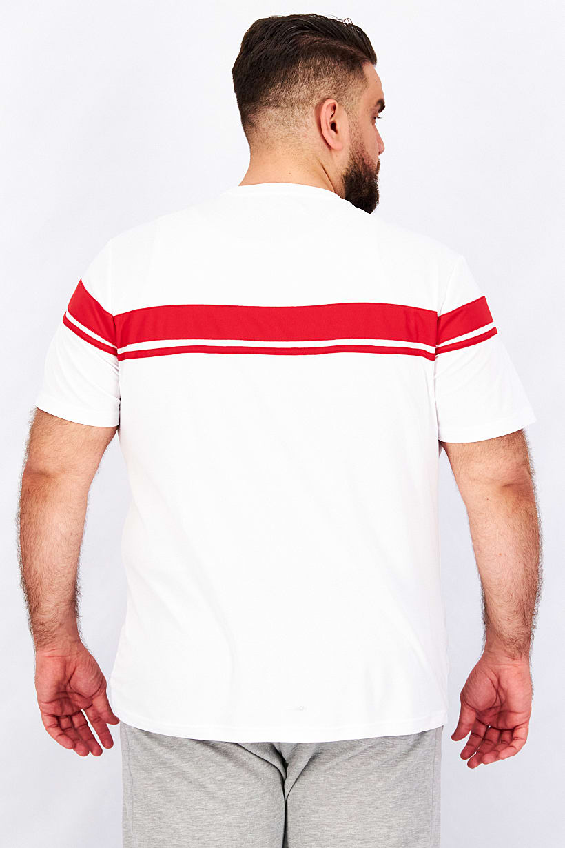 | nameOriginal | Men Crew Neck Short Sleeve Embroidered Logo Stripe Tee, White and Red |