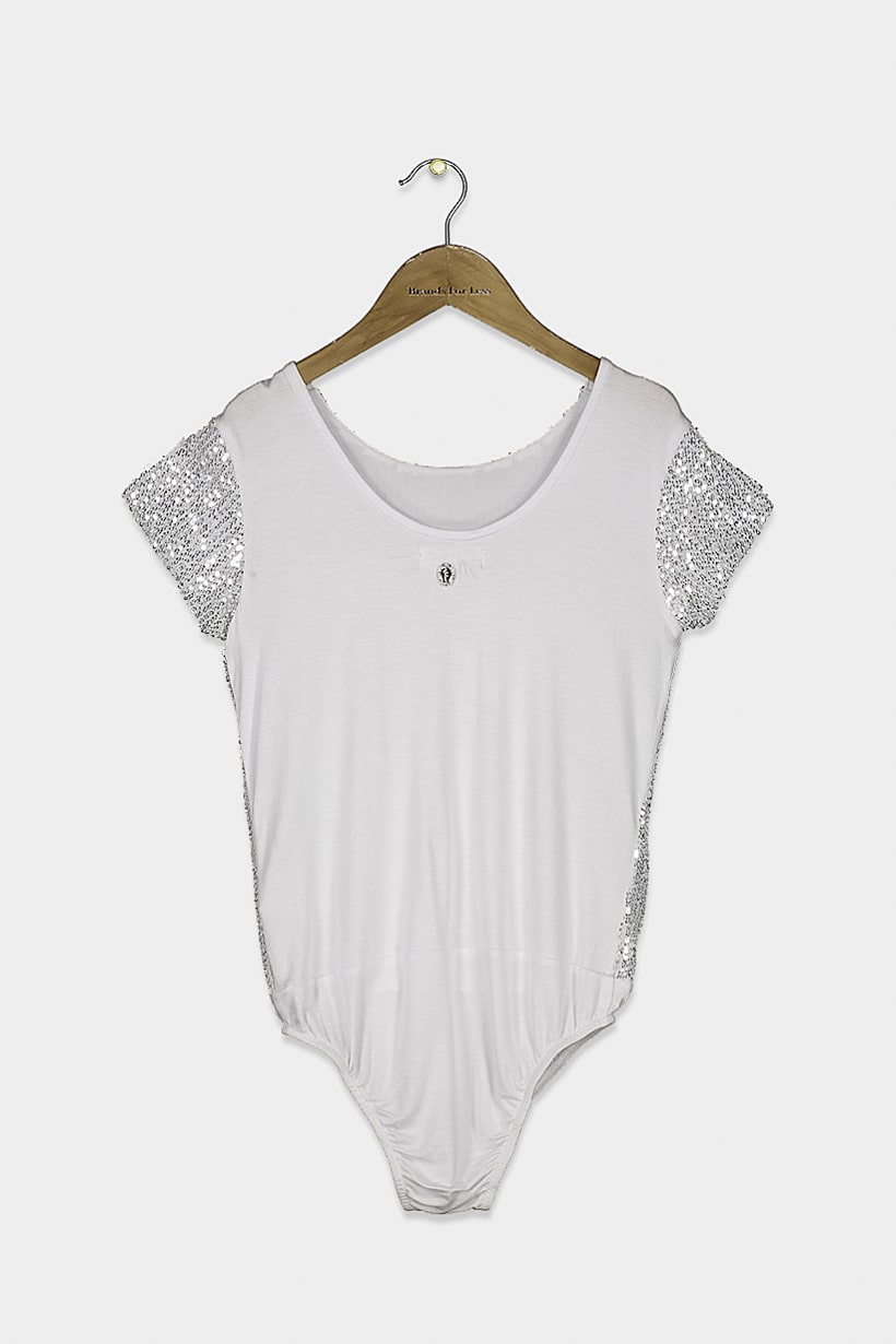 White and Silver Sequin Short Sleeve Bodysuit for Girls.