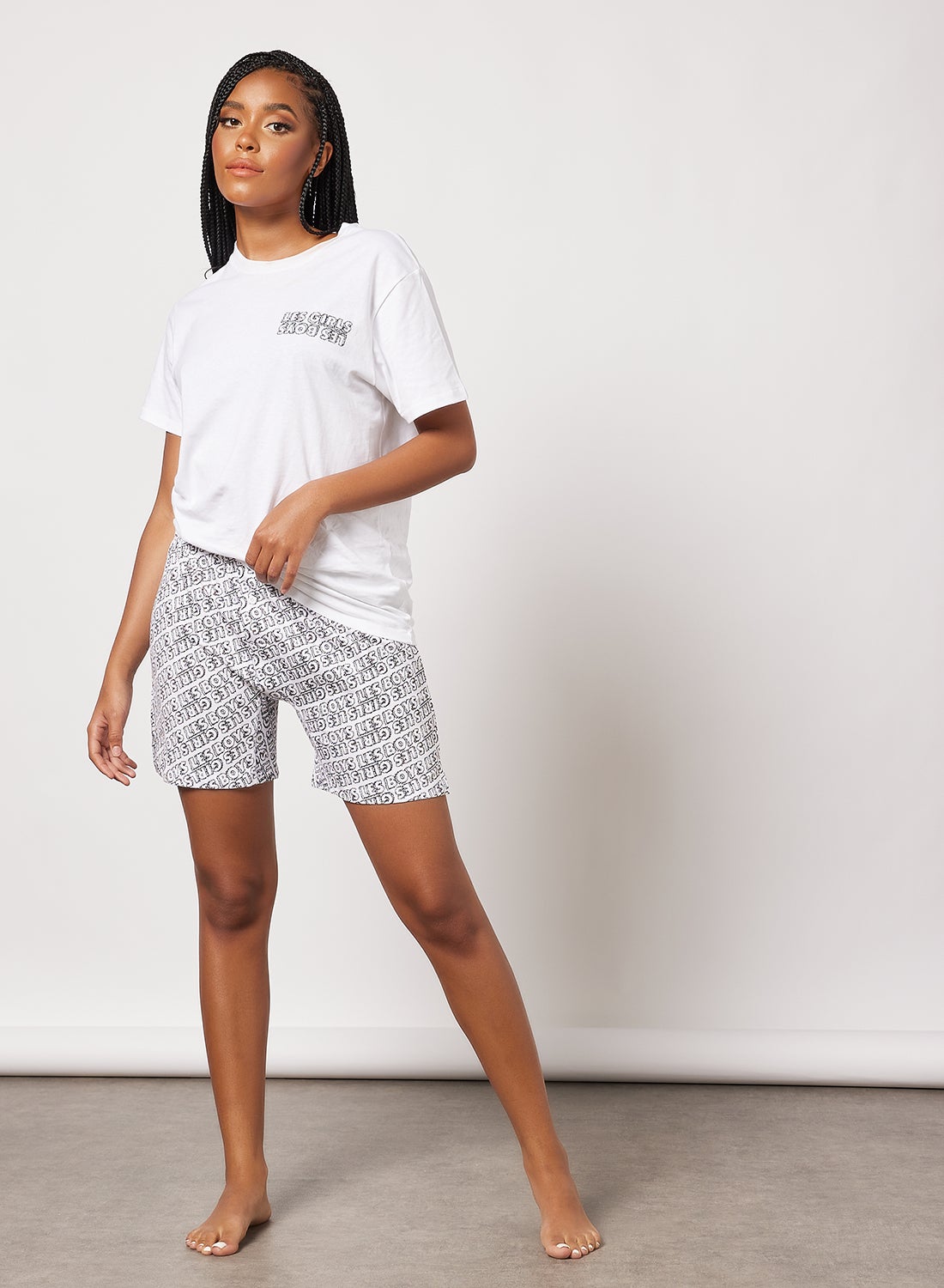 This product features a cozy cotton material that feels gentle on the skin. It showcases a stylish wordmark print design throughout the fabric. The waistband is elasticated, allowing for a customizable fit. The fit is regular and comfortable. To maintain the quality of the product, please follow the care label instructions when washing. The Les Girls Les Boys signature branding detail adds a touch of sophistication. The model in the photo is approximately 172cm tall and is wearing a size S.