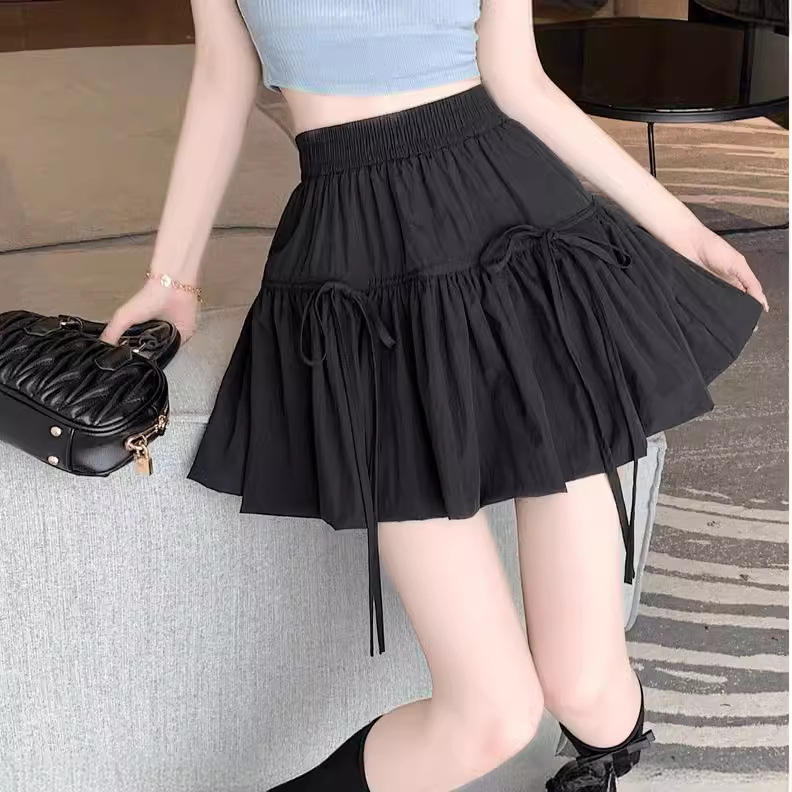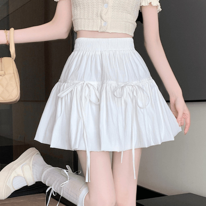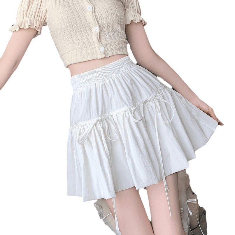 White Cake Skirt Women's Summer Ballet Style High Waist Puffy Skirt A- Line Lace-up Bud Short Skirt with Wood-ear Edge Skirt