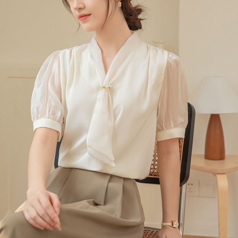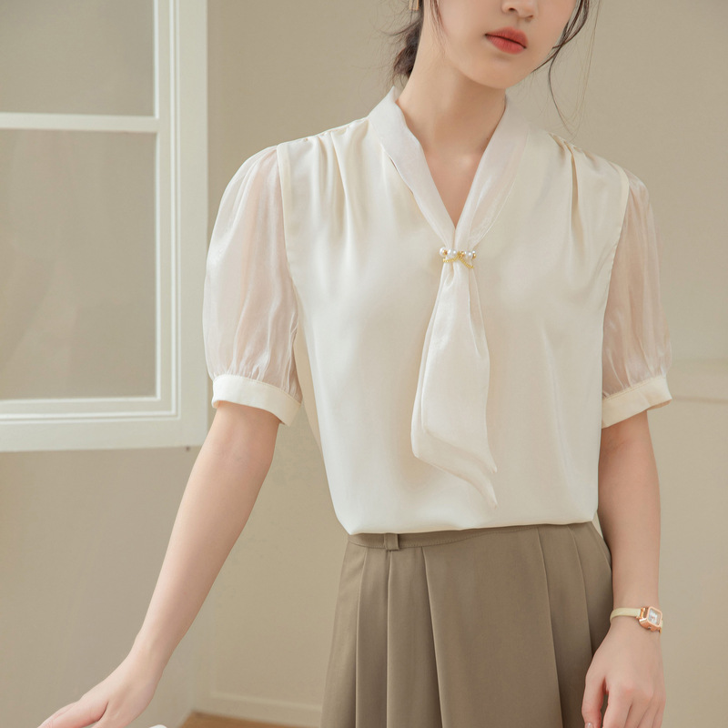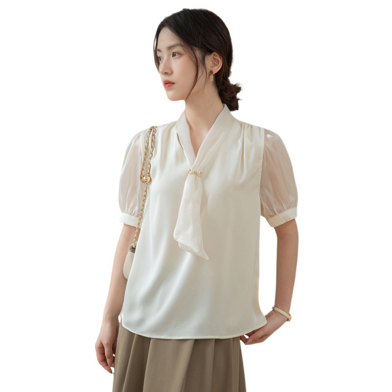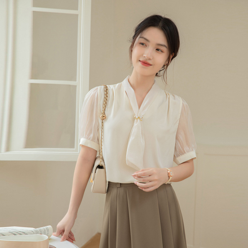| nameOriginal | White Chiffon Strap Shirt Women's Short-sleeved Summer Design Sense Niche Hong Kong Style Commuter Professional Top All-match Lace-up |