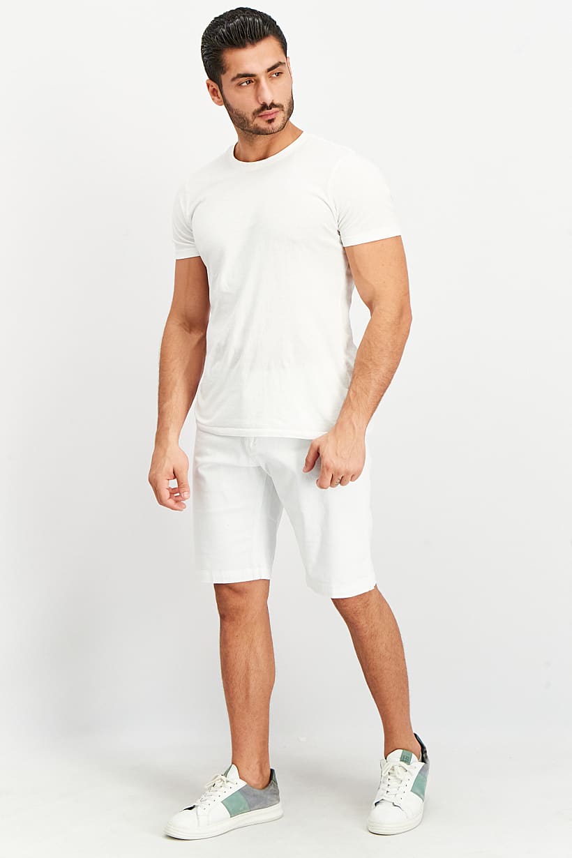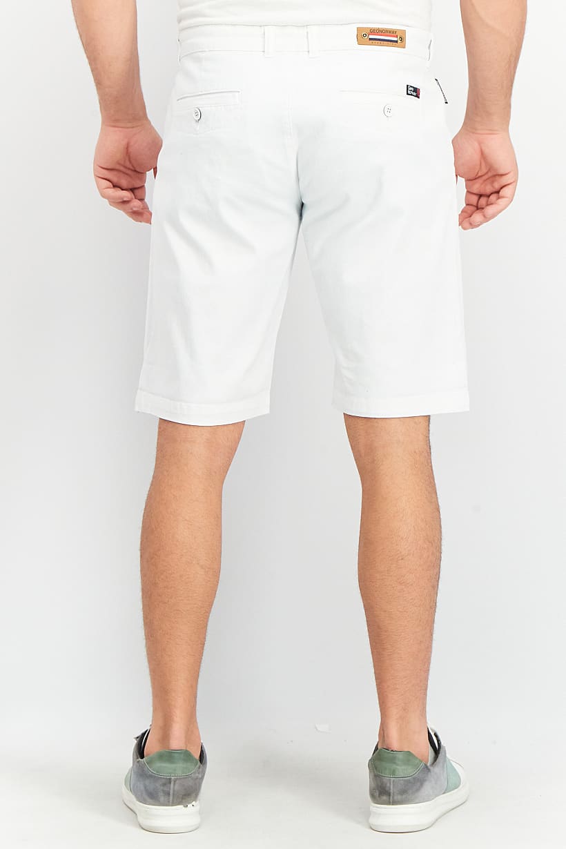 Care : Machine washable, Fit : Regular fit, No of pockets : 5, Size shown : International, Stretch Type : Stretchable, Type of Short : Basic short, Bottom Closure : Button, Fabrics : 98% Cotton, 2% Elastane, Occasion : Casual, Pattern & Print : Plain/Solid, Color Family : White,