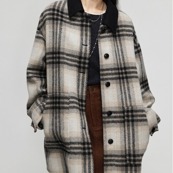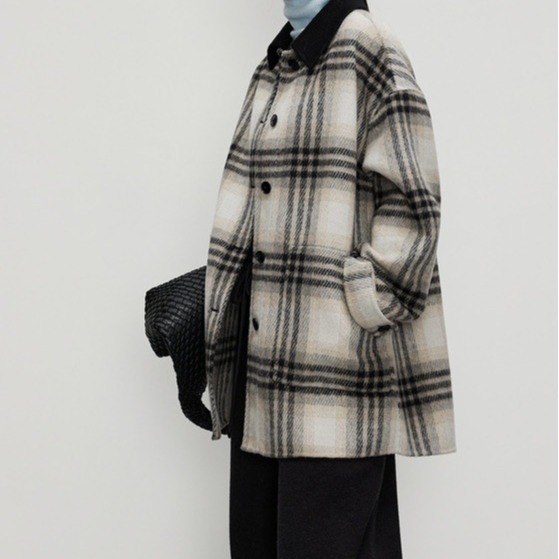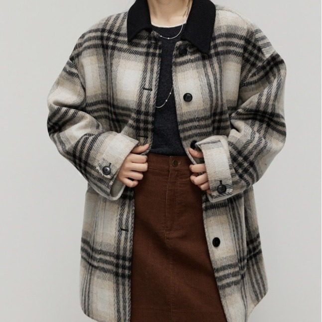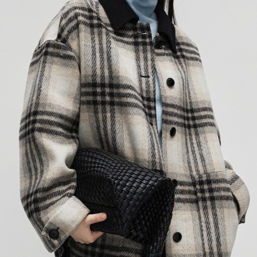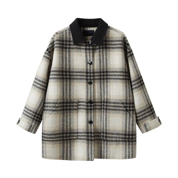 White coffee plaid double-sided wool coat for women 2023 Winter new hit collar color matching woolen coat small woolen coat