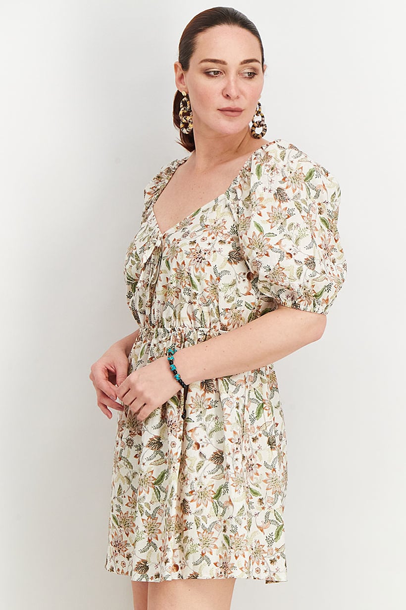 Women Floral Print Puff Sleeves Mini Dress, White Combo