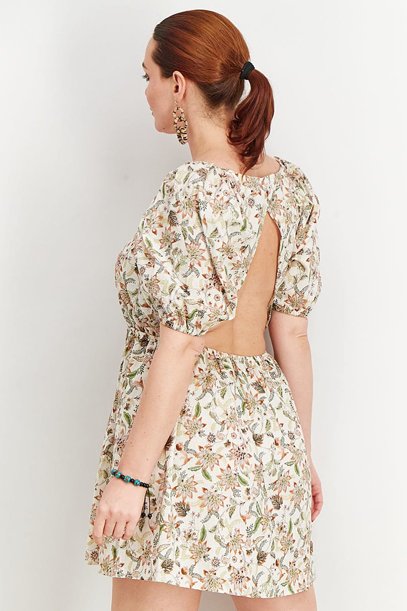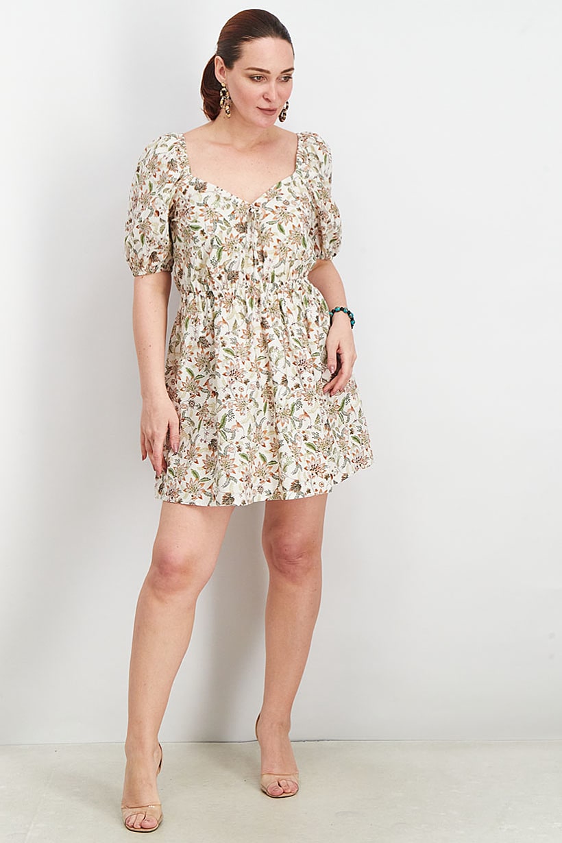 Care : Machine washable, Dress Style : Mini, Fit : Regular fit, Size shown : International, Types of Hem : Straight hem, Types of Neckline & Collar : V-neckline, Types of Sleeve : Puffed sleeve , Disclaimer : Product color may slightly vary due to photographic lighting sources or your monitor settings., Fabrics : 100% Cotton, Occasion : Casual, Pattern & Print : Floral Print, Types of Closures : Pullover, Color Family : White,