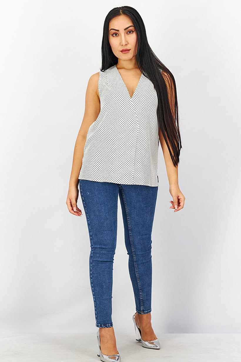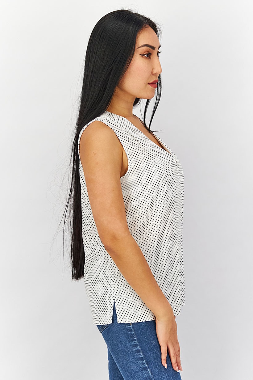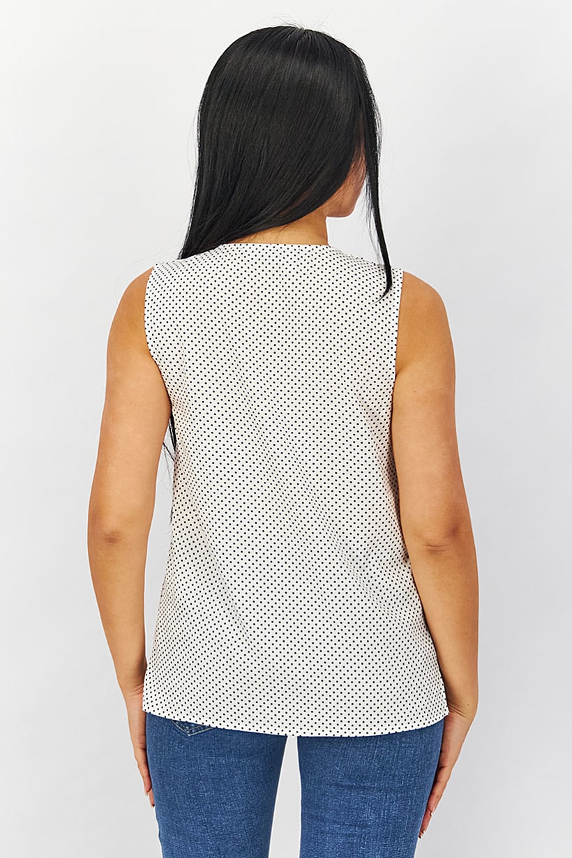 White Combo Polka Dots Sleeveless Top for Women with V-neck.