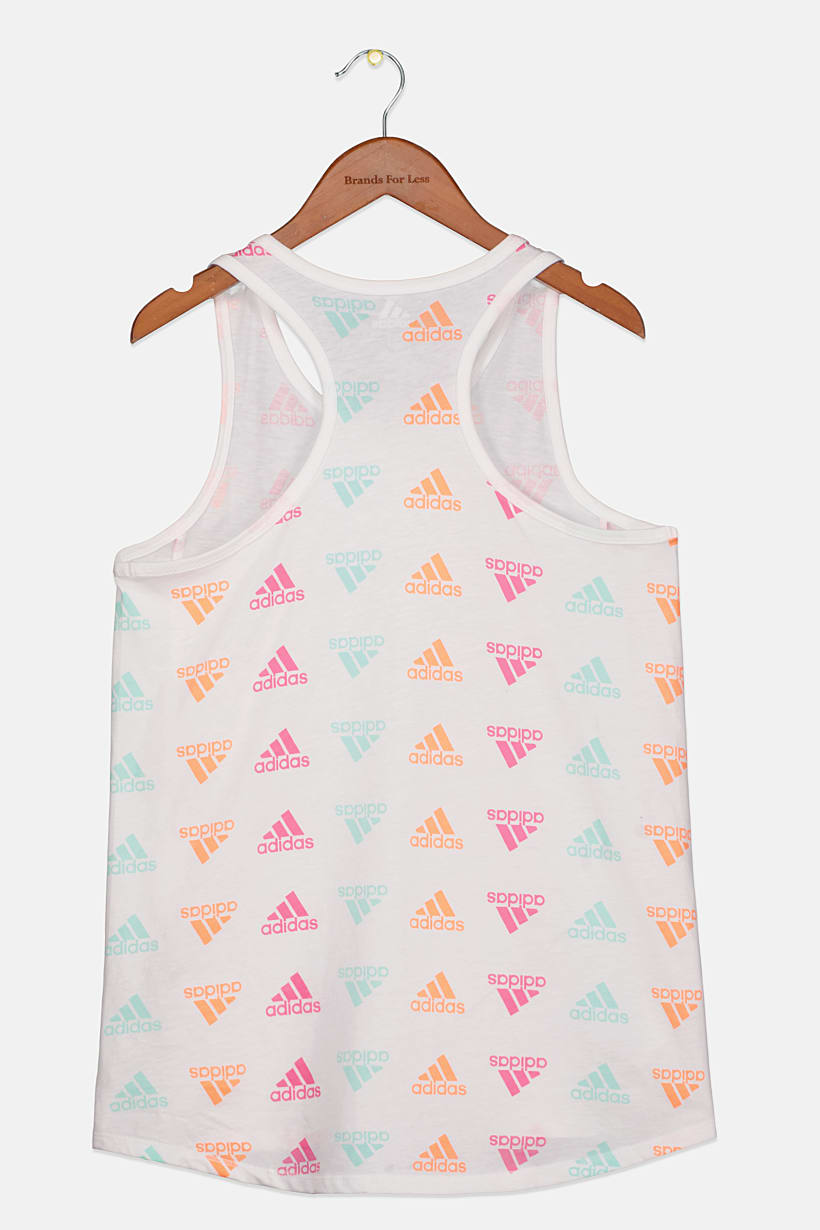 White Combo Tie-Front Tank Top with Printed Logo for Girls.