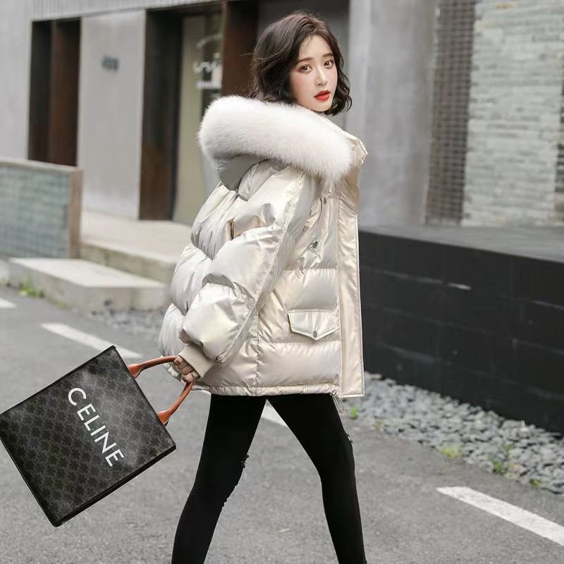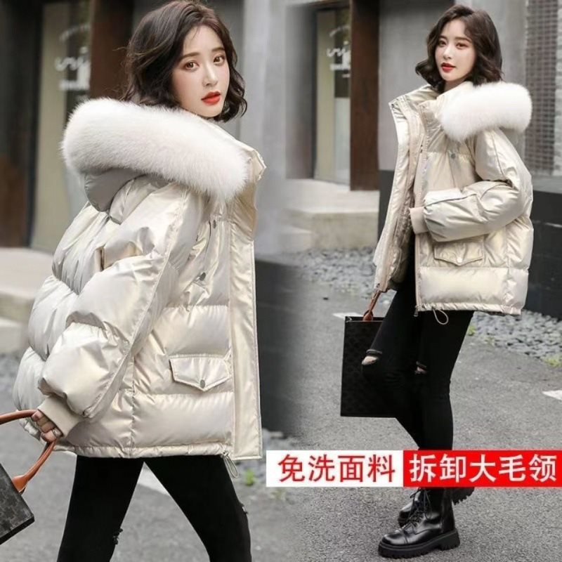 White Duck Down Wash-Free Bright Down Jacket Women’s Winter Short Korean Style Large Wool Collar Thickened Loose Bread Suit with Hood