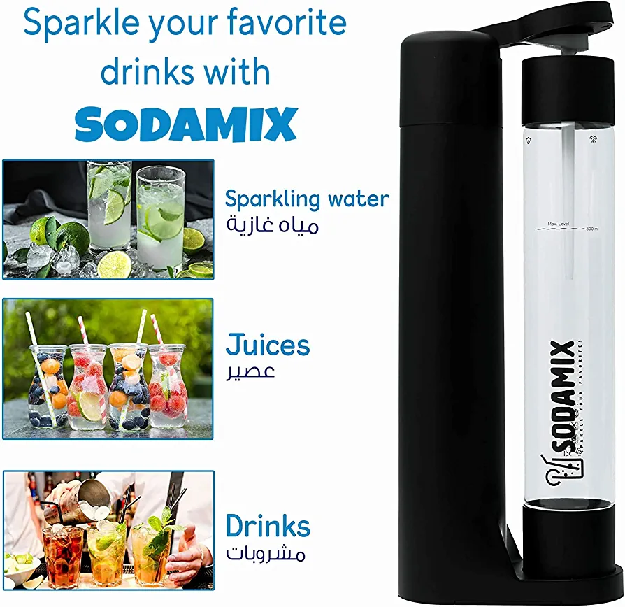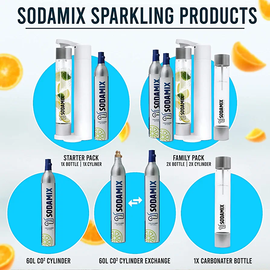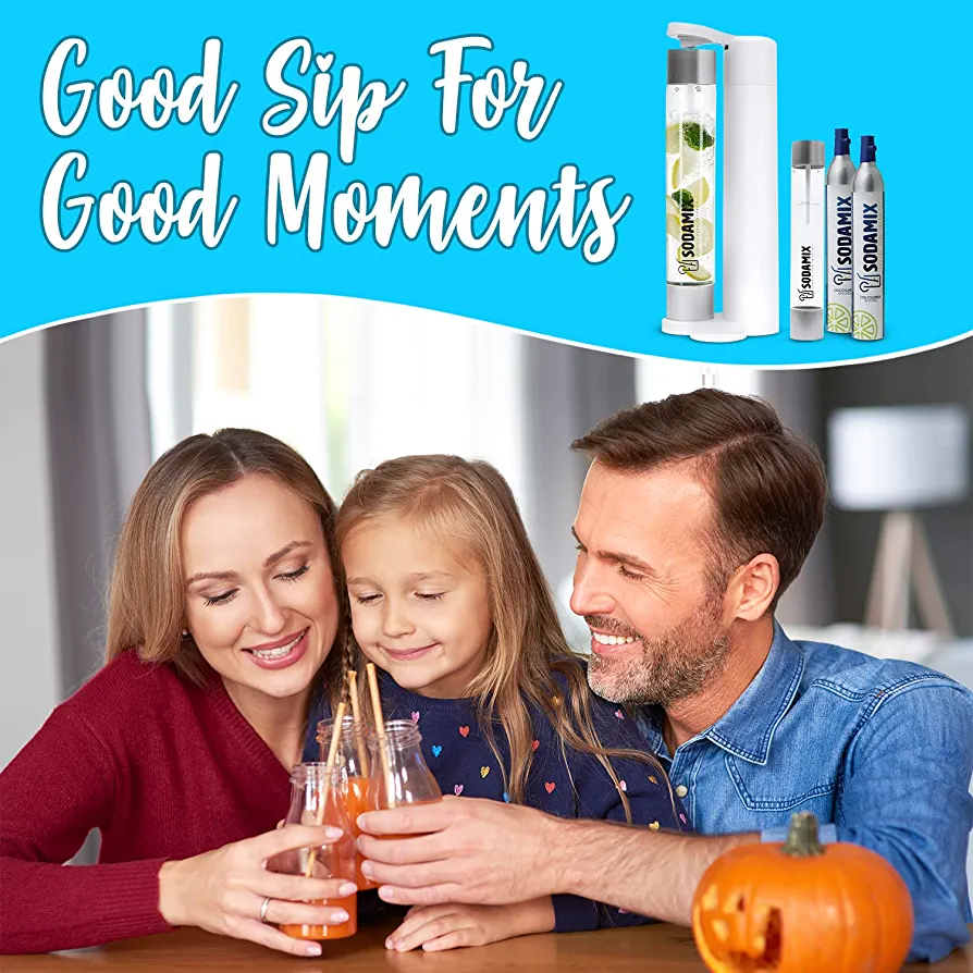 | nameOriginal | Sodamix Sparkling Water Maker Family Package, Carbonates All Kinds of Beverages, No Battery, Portable Soda Maker, 2 BPA-FREE Carbonation Bottles, 2 Full CO2 Aluminum Cylinders. (White Family Pack) |
