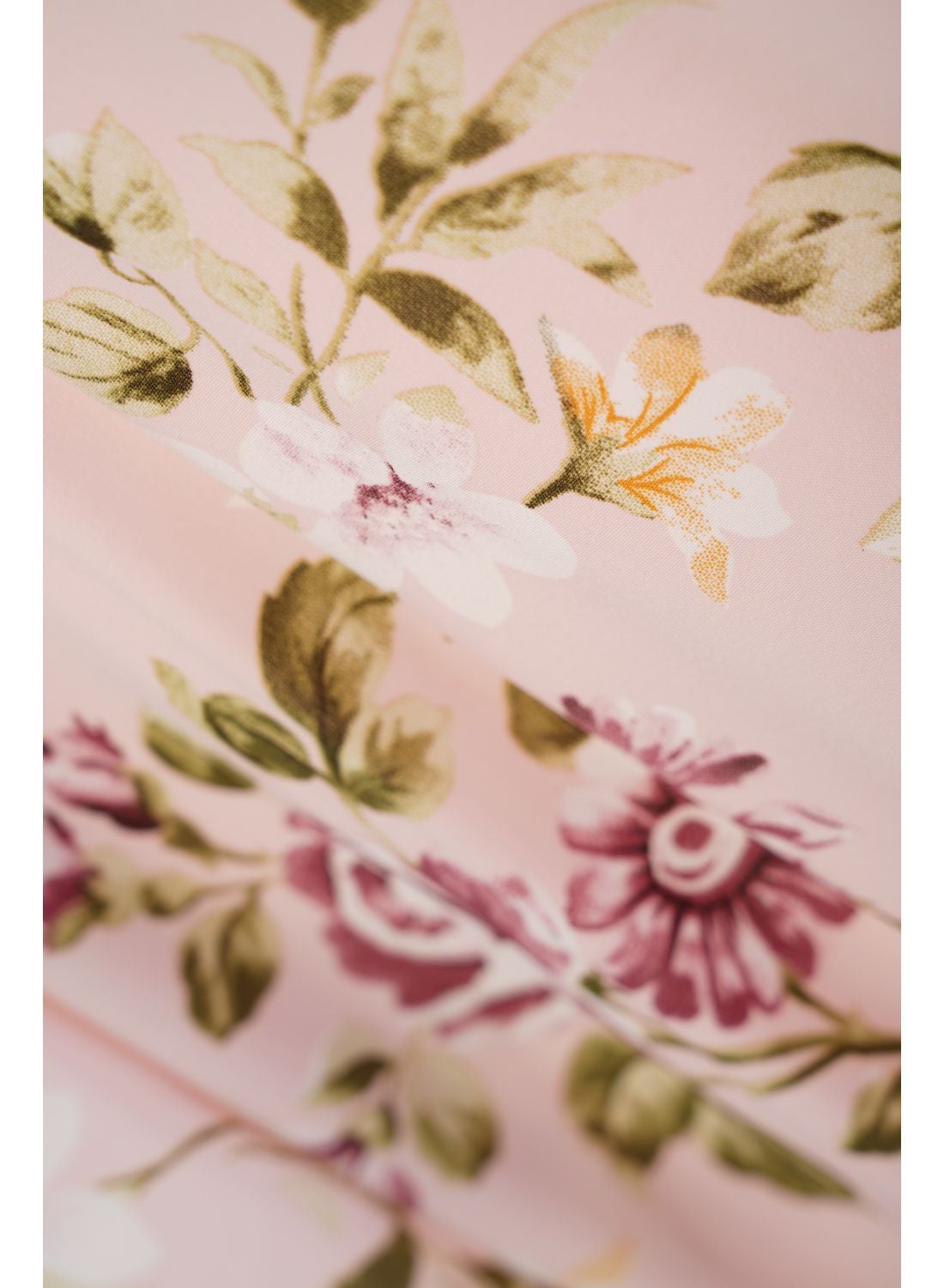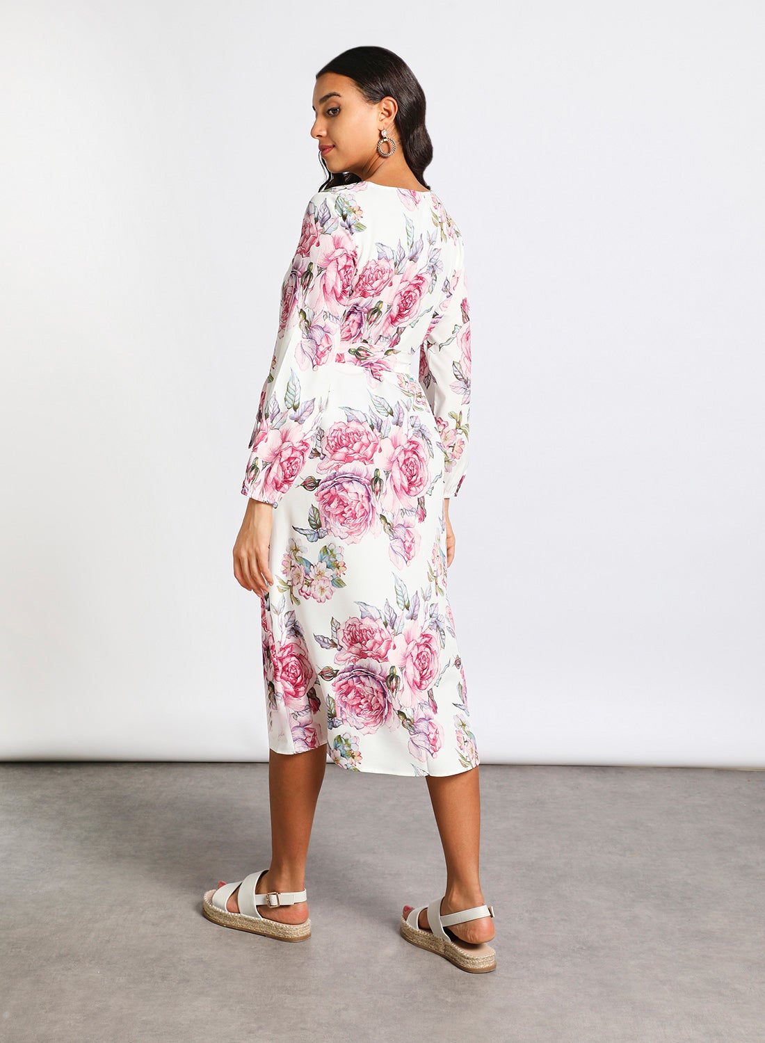White Floral Print Maxi Dress with Long Sleeves and Round Neck.