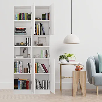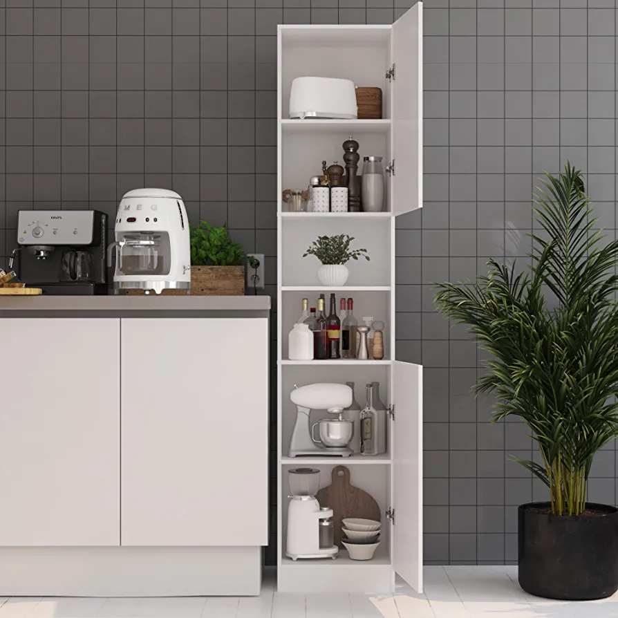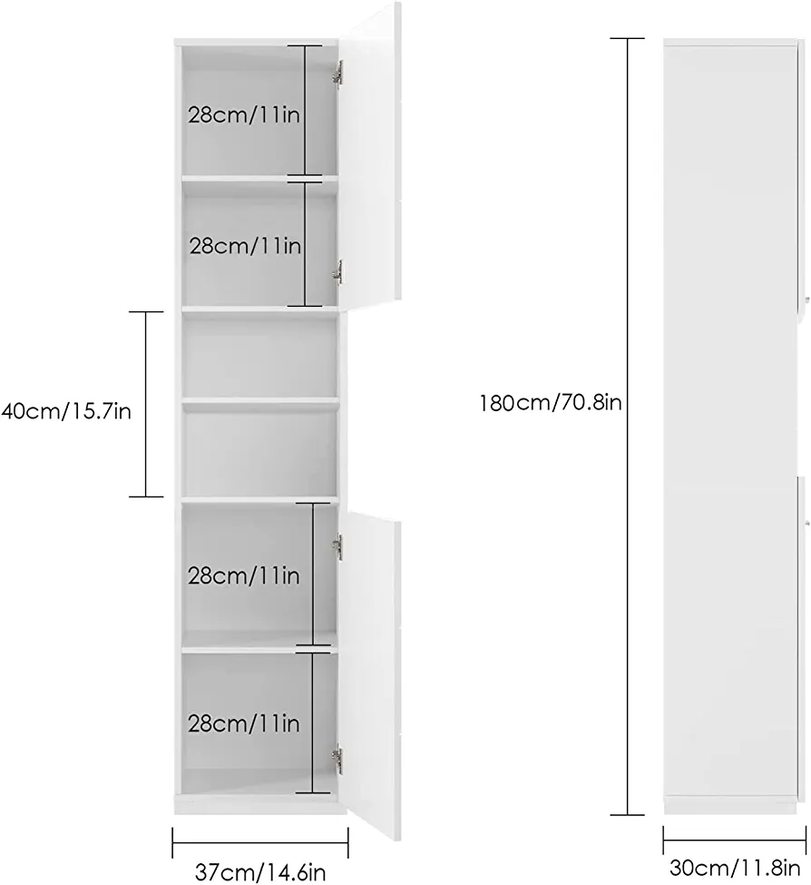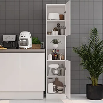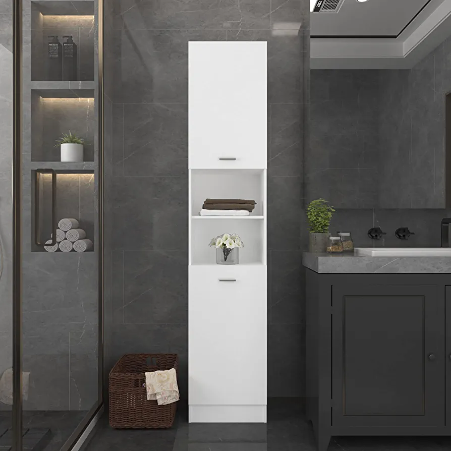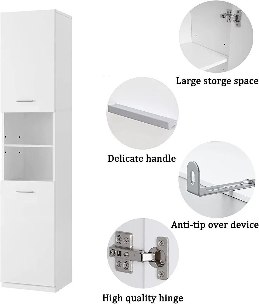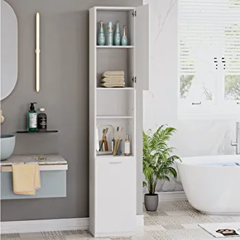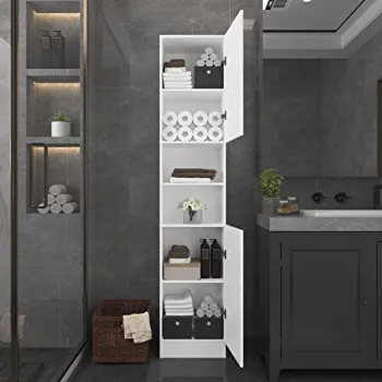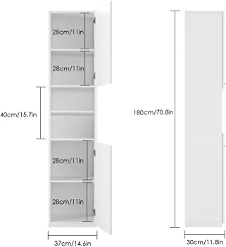 This floor cabinet is made of MDF and comes in a sleek white color. It measures 14.6″L x 11.8″W x 70.8″H and weighs 55.5 lb ( kg). The package includes 1 x floor cabinet, 1 x accessory kit, and 1 x set of instructions.
