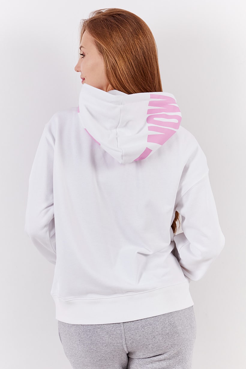 White Graphic Print Hooded Sweatshirt for Women with Long Sleeves.
