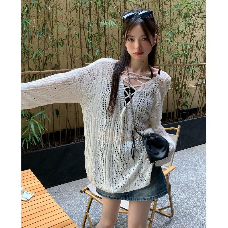 White Hollow Drawstring Strap Collar Sunscreen Knitwear Women’s Summer Early Autumn Ice Silk Thin Air Conditioning Blouse Top