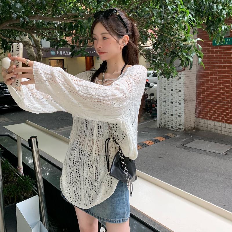 White Hollow Drawstring Strap Collar Sunscreen Knitwear Women's Summer Early Autumn Ice Silk Thin Air Conditioning Blouse Top